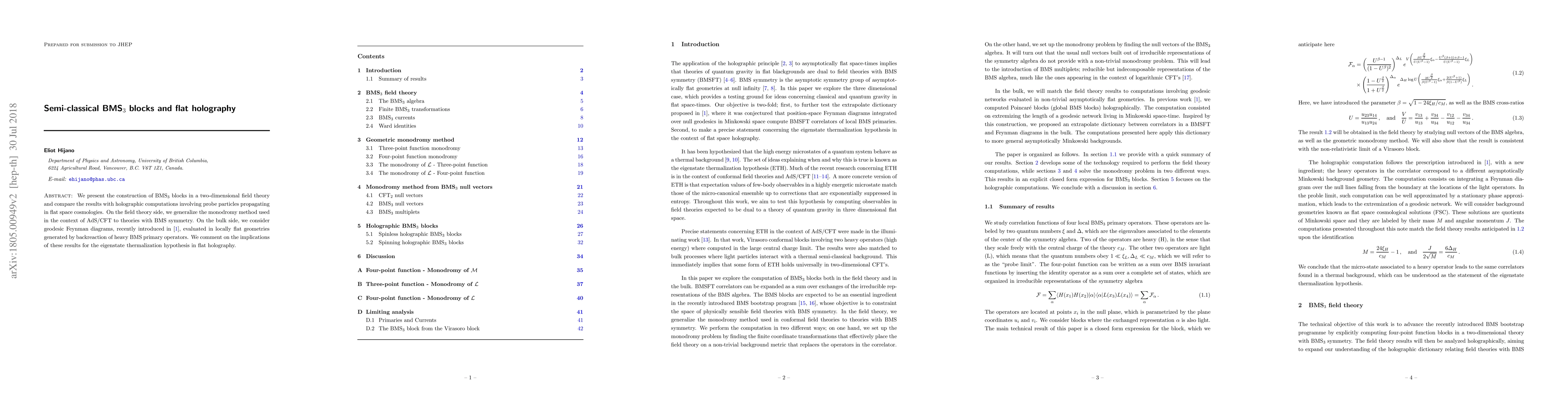 This paper constructs BMS$_3$ blocks in a two-dimensional field theory and compares them with holographic computations of probe particles in flat space cosmology. The study employs a generalized monodromy method and geodesic Feynman diagrams in locally flat geometries, discussing implications for the eigenstate thermalization hypothesis in flat holography.