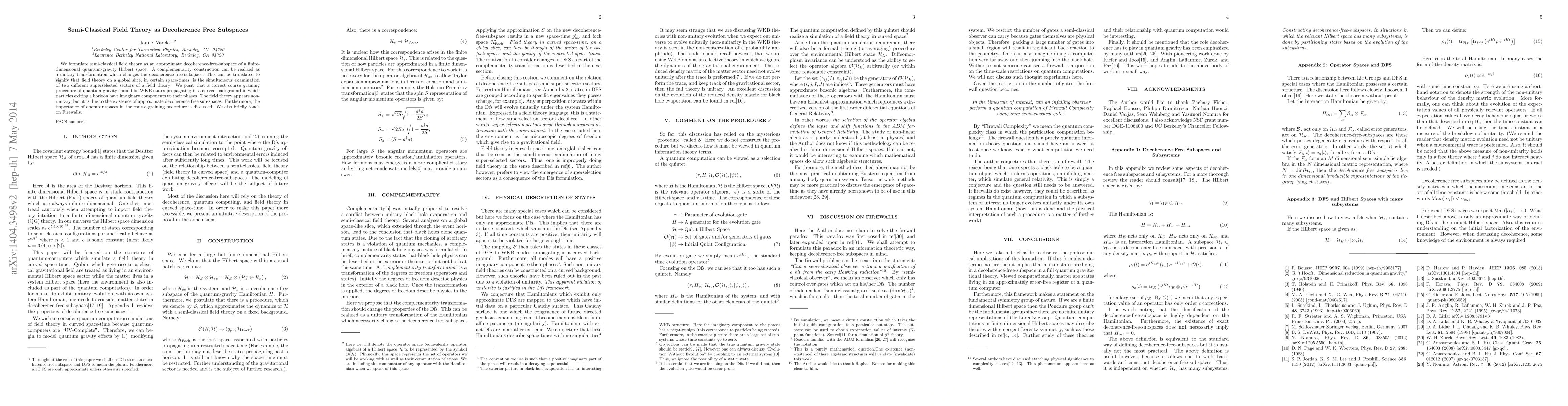 We formulate semi-classical field theory as an approximate decoherence-free-subspace of a finite-dimensional quantum-gravity hilbert space. A complementarity construction can be realized as a unitary transformation which changes the decoherence-free-subspace. This can be translated to signify that field theory on a global slice, in certain space-times, is the simultaneous examination of two different superselected sectors of a field theory. We posit that a correct course graining procedure of quantum gravity should be WKB states propagating in a curved background in which particles exiting a horizon have imaginary components to their phases. The field theory appears non-unitary, but it is due to the existence of approximate decoherence free sub-spaces. Furthermore, the importance of operator spaces in the course-graining procedure is discussed. We also briefly touch on Firewalls.