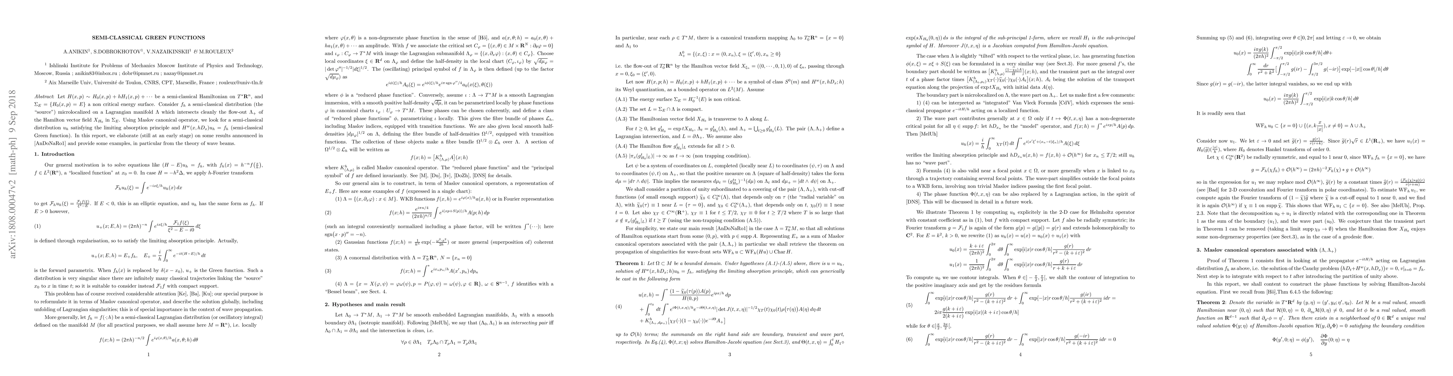 Let $H(x,p)\sim H_0(x,p)+hH_1(x,p)+\cdots$ be a semi-classical Hamiltonian on $T^*{\bf R}^n$, and $\Sigma_E=\{H_0(x,p)=E\}$ a non critical energy surface. Consider $f_h$ a semi-classical distribution (the "source") microlocalized on a Lagrangian manifold $\Lambda$ which intersects cleanly the flow-out $\Lambda_+$ of the Hamilton vector field $X_{H_0}$ in $\Sigma_E$. Using Maslov canonical operator, we look for a semi-classical distribution $u_h$ satisfying the limiting absorption principle and $H^w(x,hD_x)u_h=f_h$ (semi-classical Green kernel). In this report, we elaborate (still at an early stage) on some results announced in [Doklady Akad. Nauk, Vol. 76, No1, p.1-5, 2017] and provide some examples, in particular from the theory of wave beams.