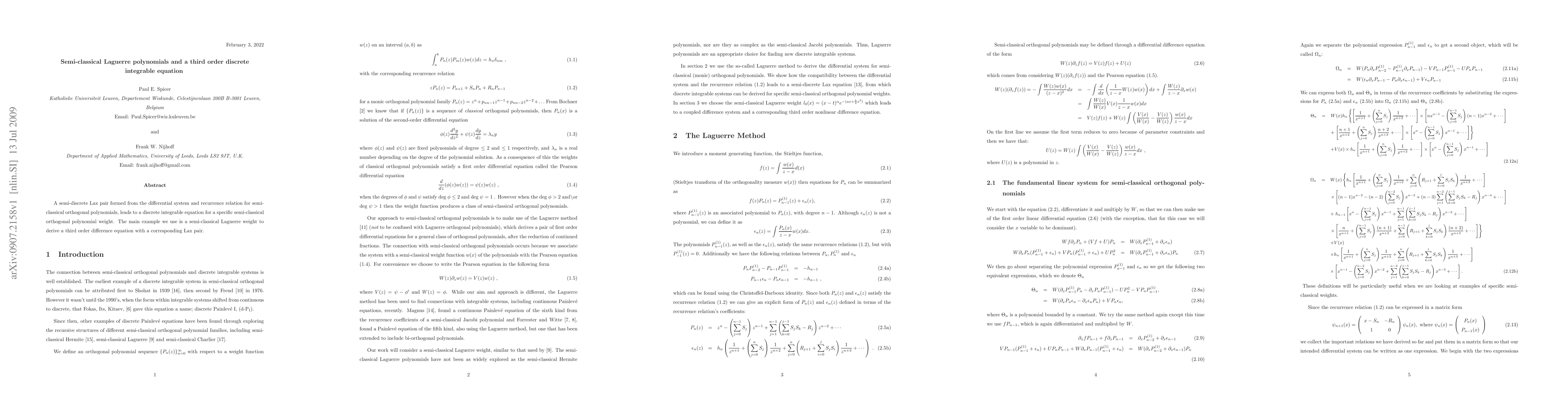 A semi-discrete Lax pair formed from the differential system and recurrence relation for semi-classical orthogonal polynomials, leads to a discrete integrable equation for a specific semi-classical orthogonal polynomial weight. The main example we use is a semi-classical Laguerre weight to derive a third order difference equation with a corresponding Lax pair.