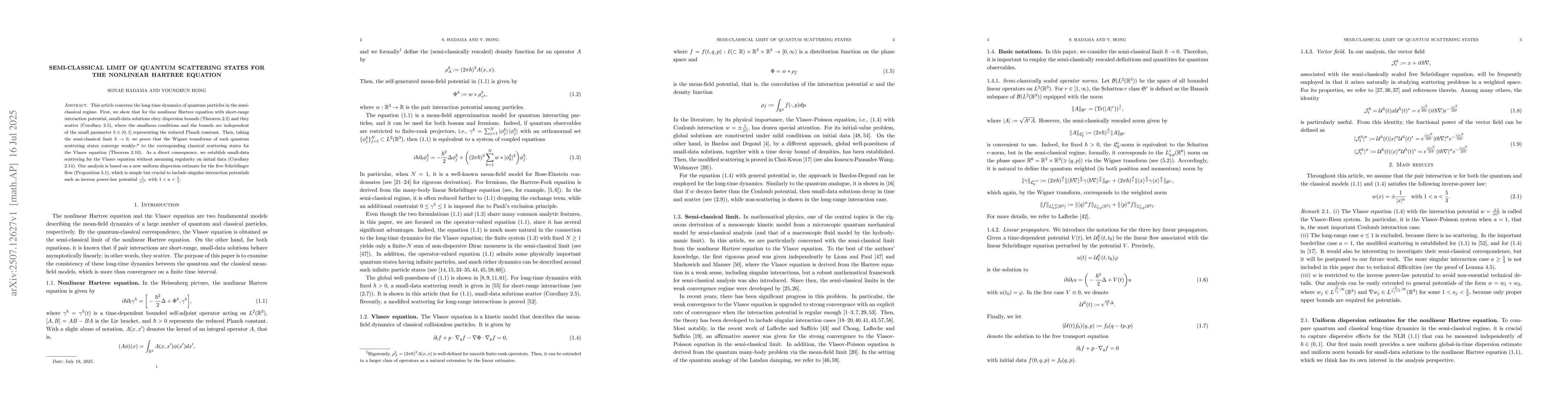 This article concerns the long-time dynamics of quantum particles in the semi-classical regime. First, we show that for the nonlinear Hartree equation with short-range interaction potential, small-data solutions obey dispersion bounds and they scatter, where the smallness conditions and the bounds are independent of the small parameter $\hbar\in(0,1]$ representing the reduced Planck constant. Then, taking the semi-classical limit $\hbar\to0$, we prove that the Wigner transforms of such quantum scattering states converge weakly-* to the corresponding classical scattering states for the Vlasov equation. As a direct consequence, we establish small-data scattering for the Vlasov equation without assuming regularity on initial data. Our analysis is based on a new uniform dispersion estimate for the free Schr\"odinger flow, which is simple but crucial to include singular interaction potentials such as inverse power-law potential $\frac{1}{|x|^a}$ with $1