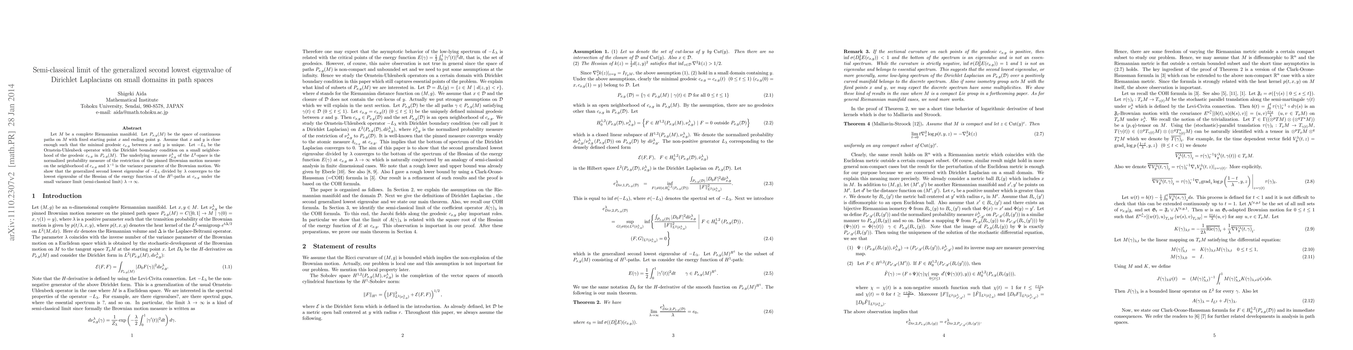 Let $M$ be a complete Riemannian manifold. Let $P_{x,y}(M)$ be the space of continuous paths on $M$ with fixed starting point $x$ and ending point $y$. Assume that $x$ and $y$ is close enough such that the minimal geodesic $c_{xy}$ between $x$ and $y$ is unique. Let $-L_{\lambda}$ be the Ornstein-Uhlenbeck operator with the Dirichlet boundary condition on a small neighborhood of the geodesic $c_{xy}$ in $P_{x,y}(M)$. The underlying measure $\bar{\nu}^{\lambda}_{x,y}$ of the $L^2$-space is the normalized probability measure of the restriction of the pinned Brownian motion measure on the neighborhood of $c_{xy}$ and $\lambda^{-1}$ is the variance parameter of the Brownian motion. We show that the generalized second lowest eigenvalue of $-L_{\lambda}$ divided by $\lambda$ converges to the lowest eigenvalue of the Hessian of the energy function of the $H^1$-paths at $c_{xy}$ under the small variance limit (semi-classical limit) $\lambda\to\infty$.