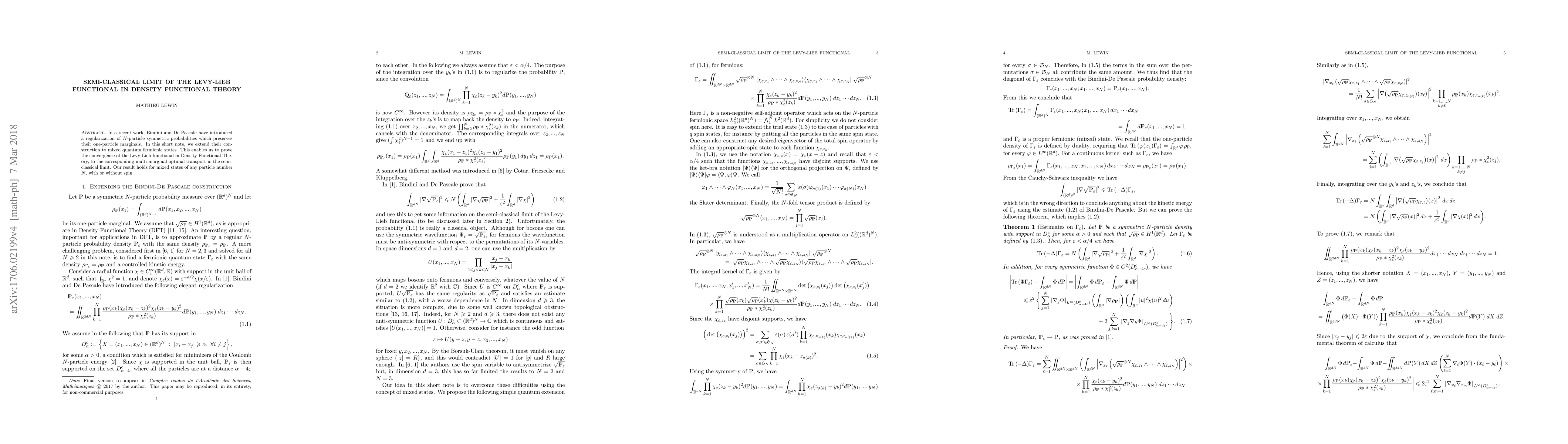 In a recent work, Bindini and De Pascale have introduced a regularization of $N$-particle symmetric probabilities which preserves their one-particle marginals. In this short note, we extend their construction to mixed quantum fermionic states. This enables us to prove the convergence of the Levy-Lieb functional in Density Functional Theory , to the corresponding multi-marginal optimal transport in the semi-classical limit. Our result holds for mixed states of any particle number $N$, with or without spin.