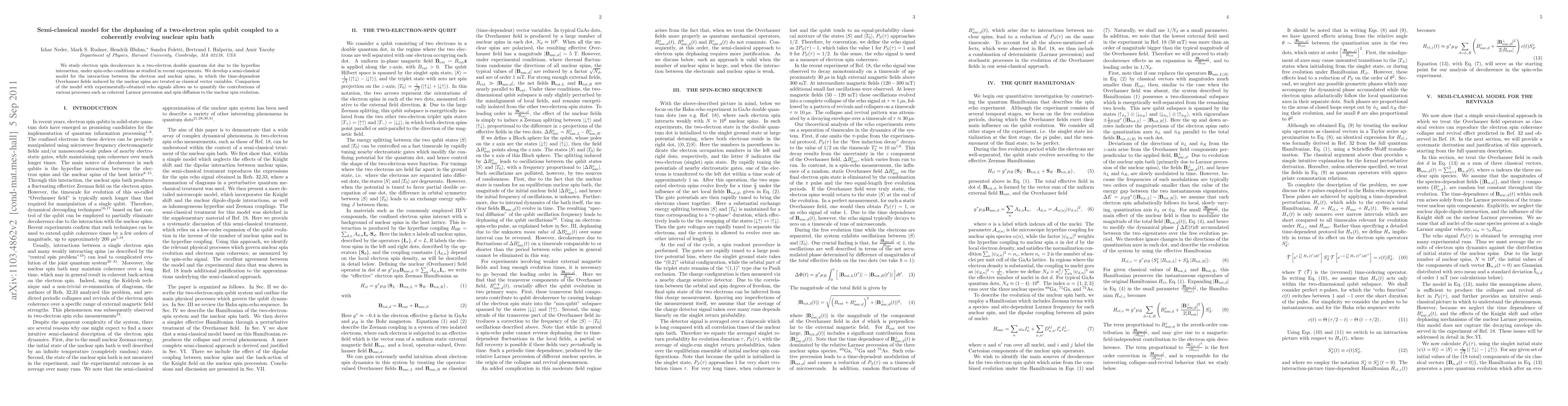 We study electron spin decoherence in a two-electron double quantum dot due to the hyperfine interaction, under spin-echo conditions as studied in recent experiments. We develop a semi-classical model for the interaction between the electron and nuclear spins, in which the time-dependent Overhauser fields induced by the nuclear spins are treated as classical vector variables. Comparison of the model with experimentally-obtained echo signals allows us to quantify the contributions of various processes such as coherent Larmor precession and spin diffusion to the nuclear spin evolution.