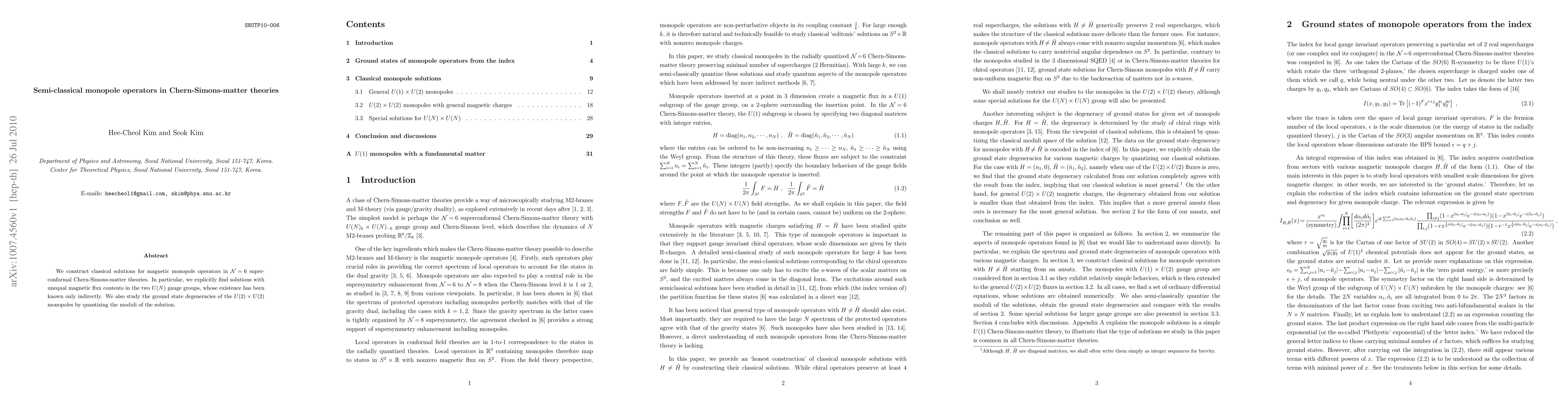 The paper constructs classical solutions for magnetic monopole operators in N=6 superconformal Chern-Simons-matter theories, finding explicit solutions with unequal magnetic flux contents. It further quantizes the moduli of U(2) x U(2) monopoles to study ground state degeneracies.