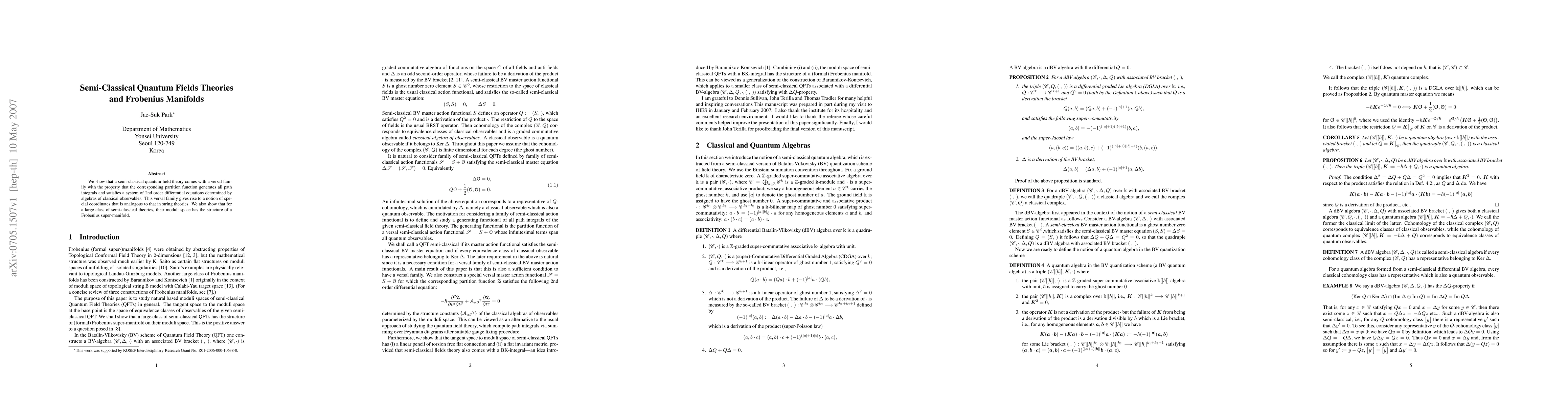 A semi-classical quantum field theory has a versal family that generates all path integrals and satisfies differential equations determined by classical observables. This leads to a notion of special coordinates analogous to string theories and moduli spaces with Frobenius super-manifold structure for many theories.