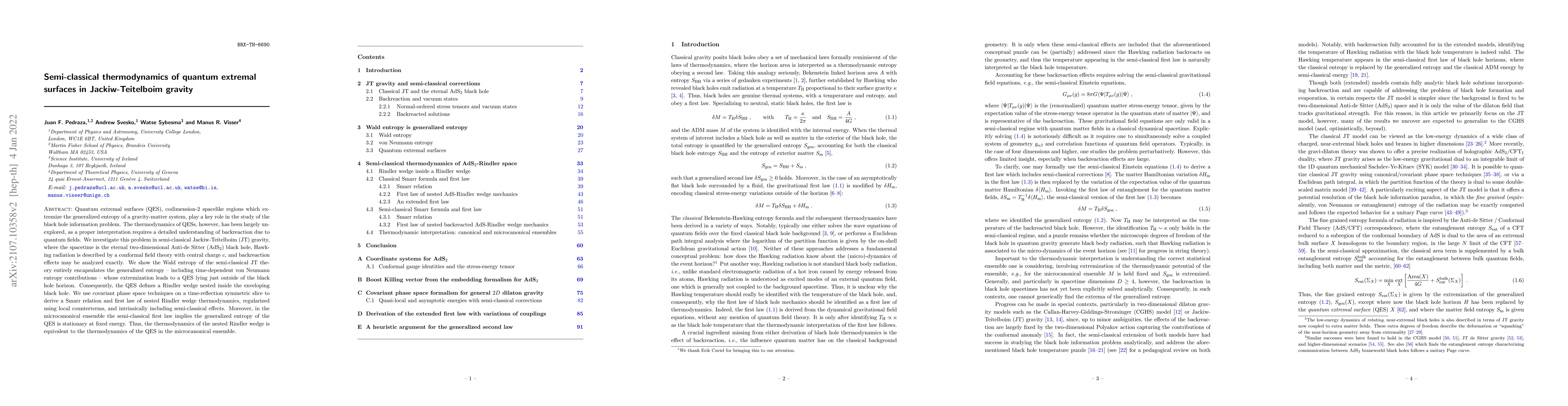 The paper derives a Smarr relation and first law for nested Rindler wedges in semi-classical JT gravity, incorporating backreaction effects and providing a detailed analysis of quantum extremal surfaces.