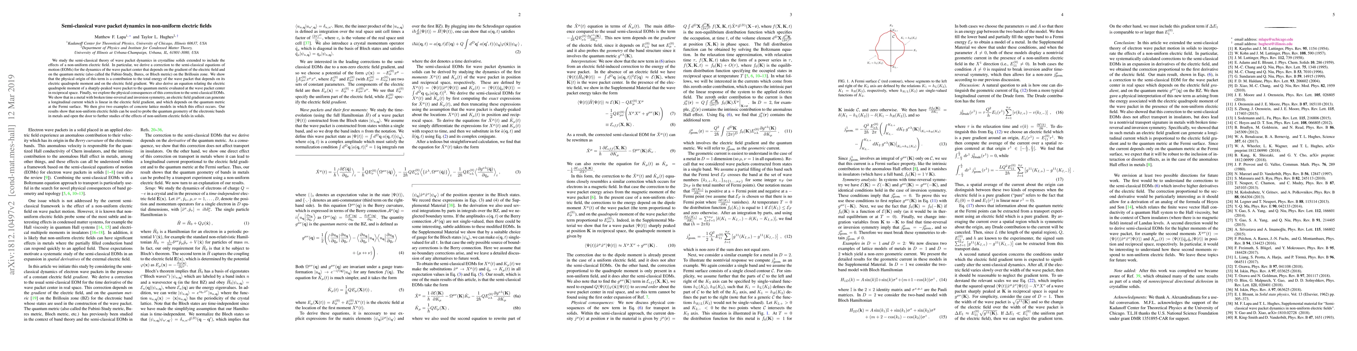 This paper derives a correction to semi-classical wave packet dynamics in non-uniform electric fields, revealing a term dependent on the electric field gradient and quantum metric. It demonstrates that such fields can generate a longitudinal current in metals with broken symmetries, highlighting the potential to probe electronic band quantum geometry.