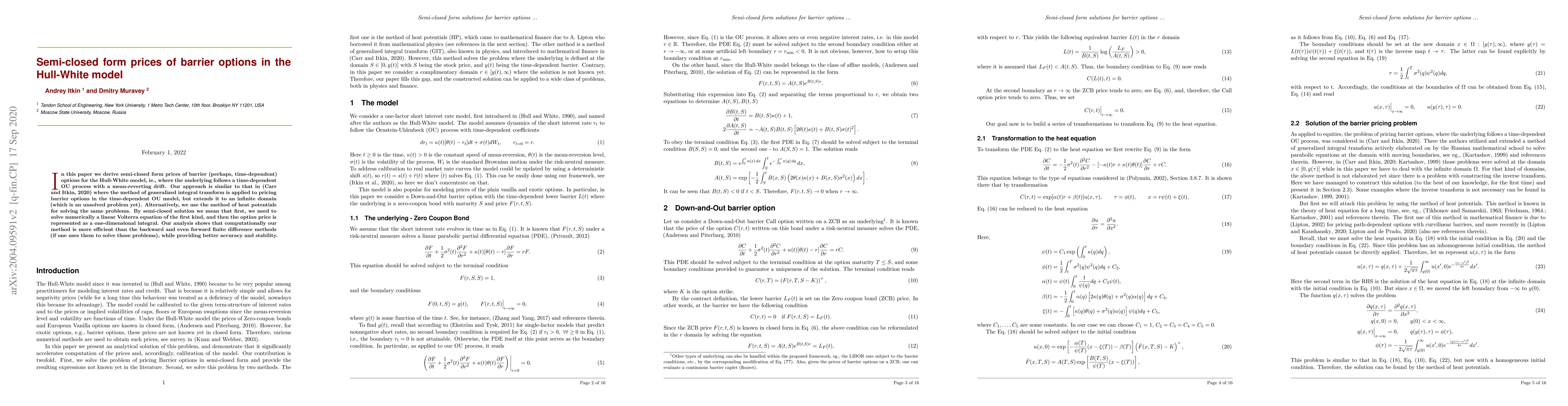 This paper derives semi-closed form prices for barrier options in the Hull-White model using generalized integral transforms and heat potentials. The method requires solving a numerically tractable linear Volterra equation and a one-dimensional integral, offering computational efficiency, accuracy, and stability compared to traditional finite difference methods.