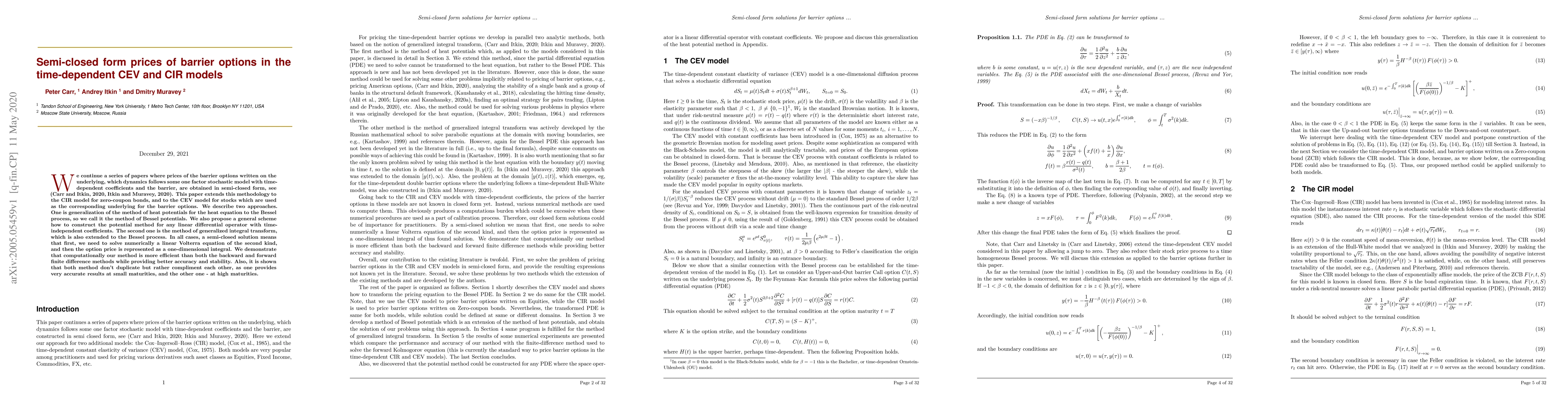 We continue a series of papers where prices of the barrier options written on the underlying, which dynamics follows some one factor stochastic model with time-dependent coefficients and the barrier, are obtained in semi-closed form, see (Carr and Itkin, 2020, Itkin and Muravey, 2020). This paper extends this methodology to the CIR model for zero-coupon bonds, and to the CEV model for stocks which are used as the corresponding underlying for the barrier options. We describe two approaches. One is generalization of the method of heat potentials for the heat equation to the Bessel process, so we call it the method of Bessel potentials. We also propose a general scheme how to construct the potential method for any linear differential operator with time-independent coefficients. The second one is the method of generalized integral transform, which is also extended to the Bessel process. In all cases, a semi-closed solution means that first, we need to solve numerically a linear Volterra equation of the second kind, and then the option price is represented as a one-dimensional integral. We demonstrate that computationally our method is more efficient than both the backward and forward finite difference methods while providing better accuracy and stability. Also, it is shown that both method don't duplicate but rather compliment each other, as one provides very accurate results at small maturities, and the other one - at high maturities.