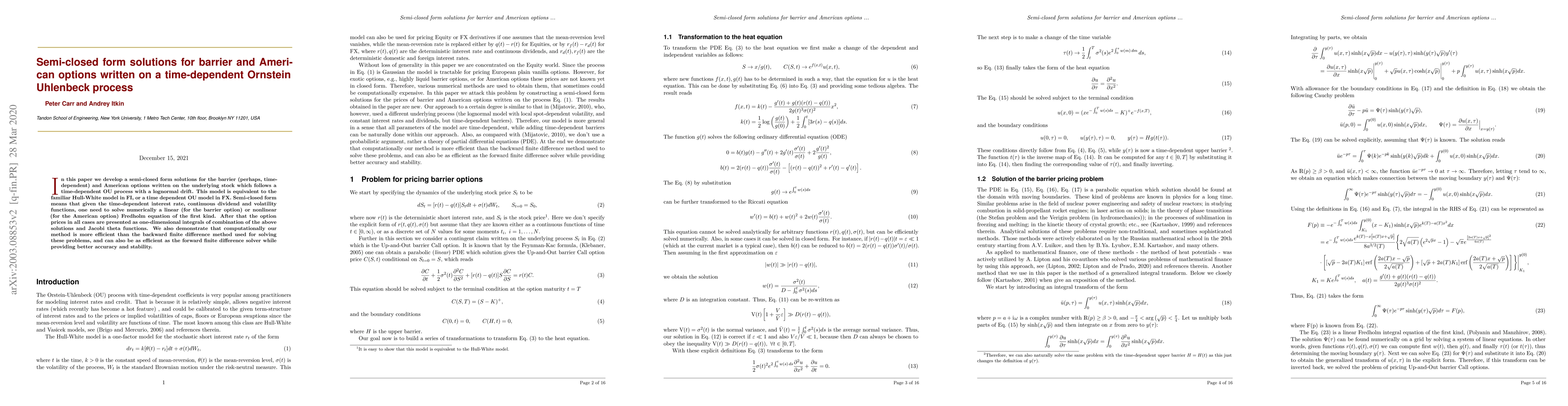 This paper develops semi-closed form solutions for barrier and American options on a time-dependent Ornstein Uhlenbeck process, requiring numerical solutions to Fredholm equations and presenting option prices as integrals involving Jacobi theta functions. The proposed method is shown to be more efficient than backward finite difference methods.