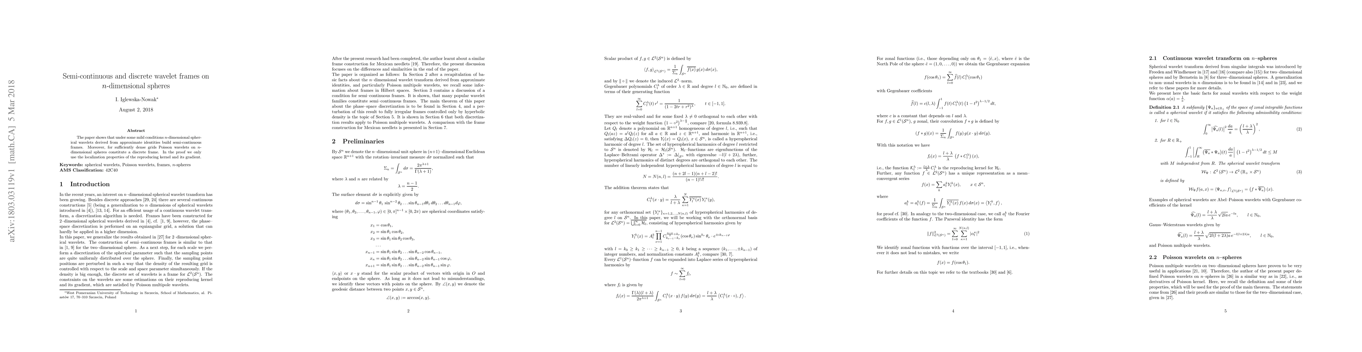 This paper shows that certain types of wavelets on n-dimensional spheres can form semi-continuous frames under mild conditions, while others form discrete frames with dense grids.