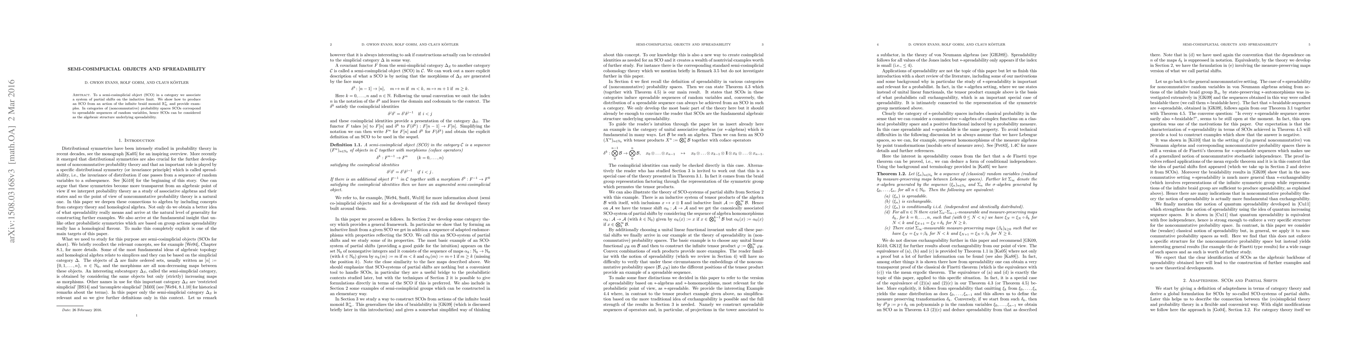 This paper introduces semi-cosimplicial objects (SCOs) in categories, associating them with systems of partial shifts on inductive limits and demonstrating their connection to the infinite braid monoid $\mathbb{B}^+_\infty$. SCOs are shown to underlie spreadable sequences of random variables in noncommutative probability spaces.
