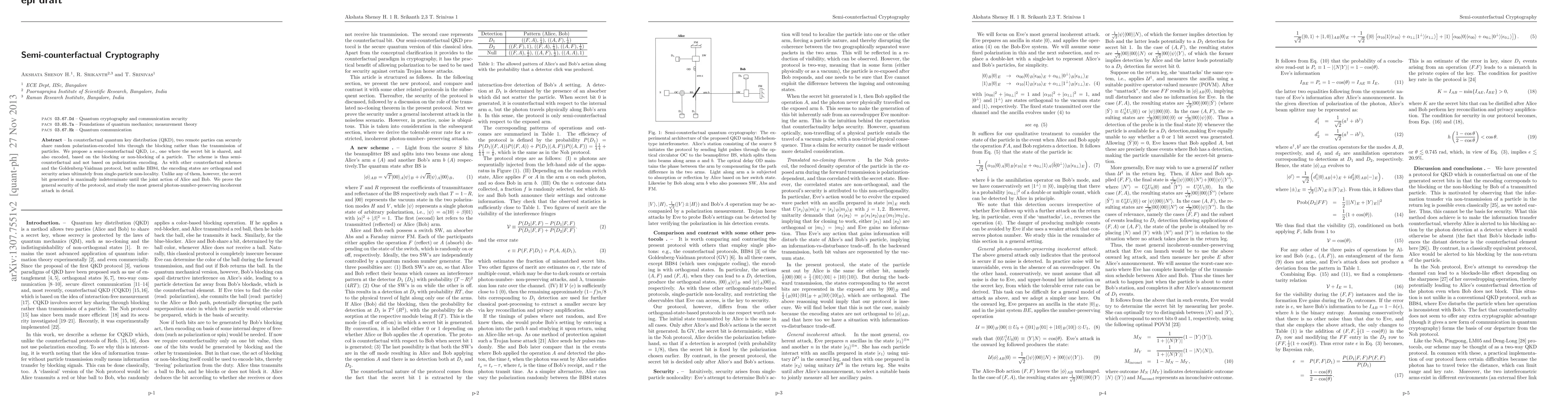 In counterfactual quantum key distribution (QKD), two remote parties can securely share random polarization-encoded bits through the blocking rather than the transmission of particles. We propose a semi-counterfactual QKD, i.e., one where the secret bit is shared, and also encoded, based on the blocking or non-blocking of a particle. The scheme is thus semi-counterfactual and not based on polarization encoding. As with other counterfactual schemes and the Goldenberg-Vaidman protocol, but unlike BB84, the encoding states are orthogonal and security arises ultimately from single-particle non-locality. Unlike any of them, however, the secret bit generated is maximally indeterminate until the joint action of Alice and Bob. We prove the general security of the protocol, and study the most general photon-number-preserving incoherent attack in detail.