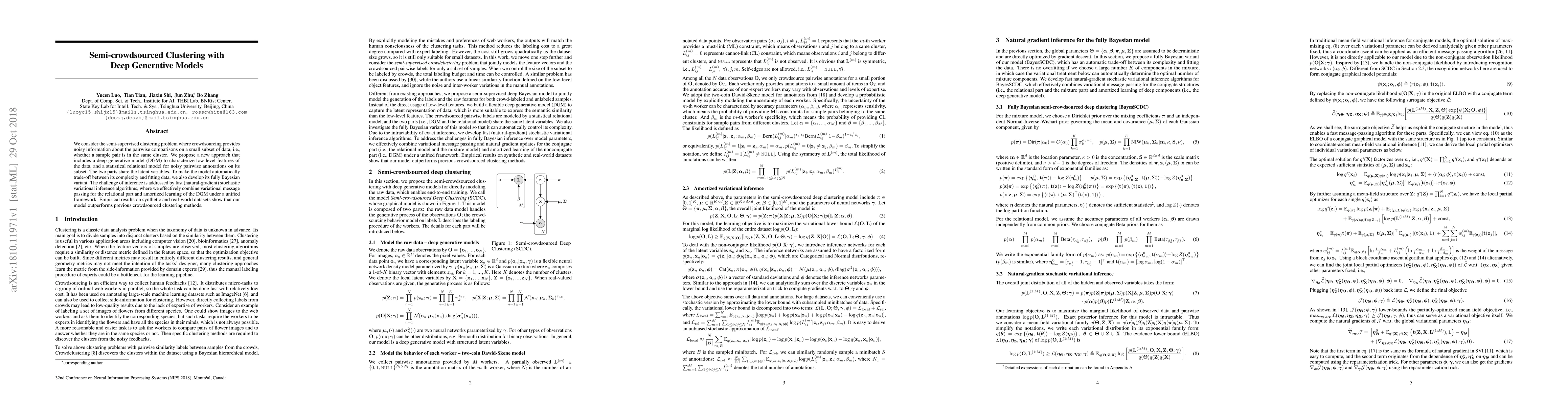 This paper proposes a semi-crowdsourced clustering method using deep generative models and a statistical relational model to handle noisy pairwise annotations from a subset of data. The approach combines variational inference and amortized learning for efficient inference, outperforming previous methods on both synthetic and real datasets.