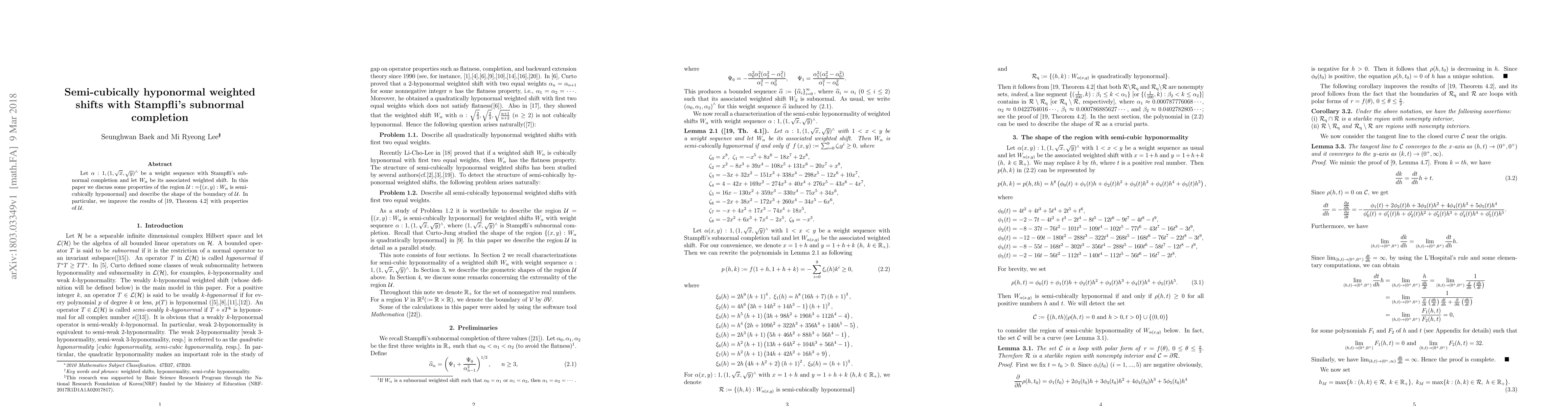 Let $\alpha :1,(1,\sqrt{x},\sqrt{y})^{\wedge }$ be a weight sequence with Stampfli's subnormal completion and let $W_{\alpha }$ be its associated weighted shift. In this paper we discuss some properties of the region $\mathcal{U}:\mathcal{=}\{(x,y):W_{\alpha }$ is semi-cubically hyponormal$\}$ and describe the shape of the boundary of $\mathcal{U}$. In particular, we improve the results of \cite[Theorem 4.2]{LLB} with properties of $\mathcal{U}$.