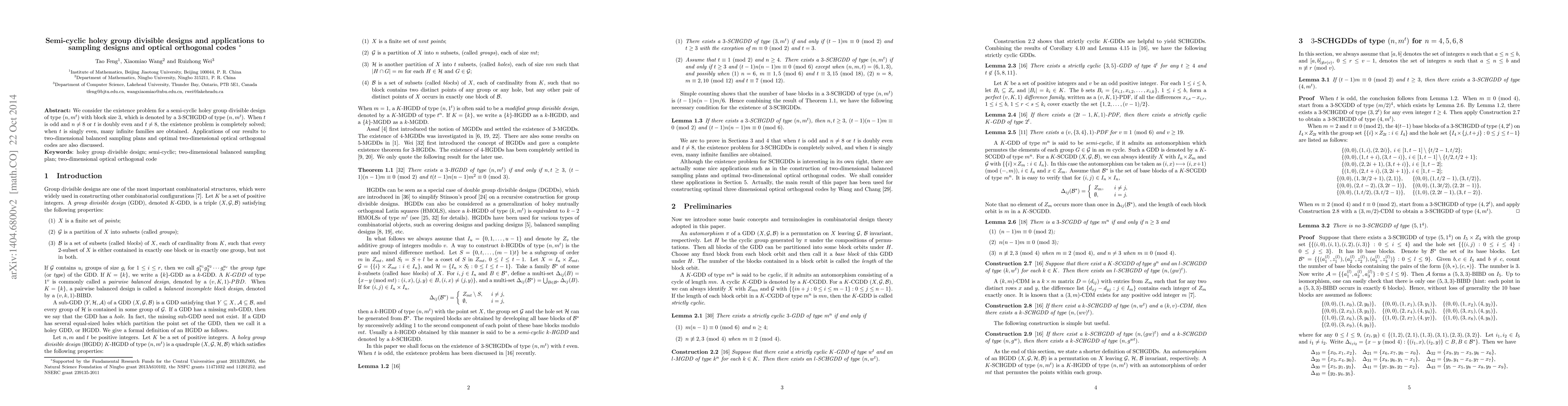 The paper solves the existence problem for semi-cyclic holey group divisible designs (3-SCHGDD) of type (n,m^t) with block size 3 for certain values of t, providing infinite families when t is singly even. Applications to balanced sampling plans and optimal optical orthogonal codes are also explored.