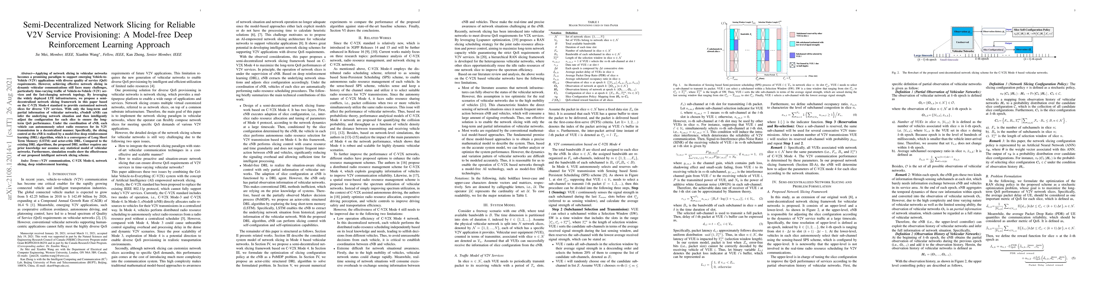 This paper proposes a semi-decentralized network slicing framework using model-free deep reinforcement learning to optimize V2V service provisioning in vehicular networks. The approach leverages LTE infrastructures and employs a DRL algorithm that does not require prior knowledge or statistical models, demonstrating improved long-term QoS performance.