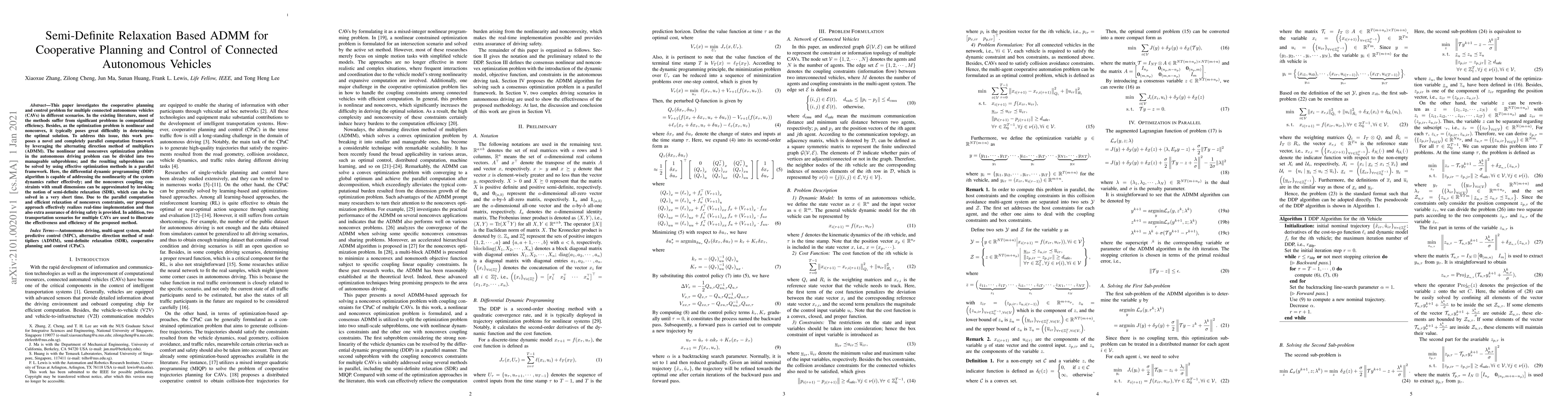 This paper proposes a novel parallel computation framework using ADMM and semi-definite relaxation to solve the cooperative planning and control problem for multiple connected autonomous vehicles, achieving real-time implementation and enhanced driving safety. The method divides the nonlinear and nonconvex optimization problem into manageable subproblems, leveraging DDP and SDR for efficient solution.
