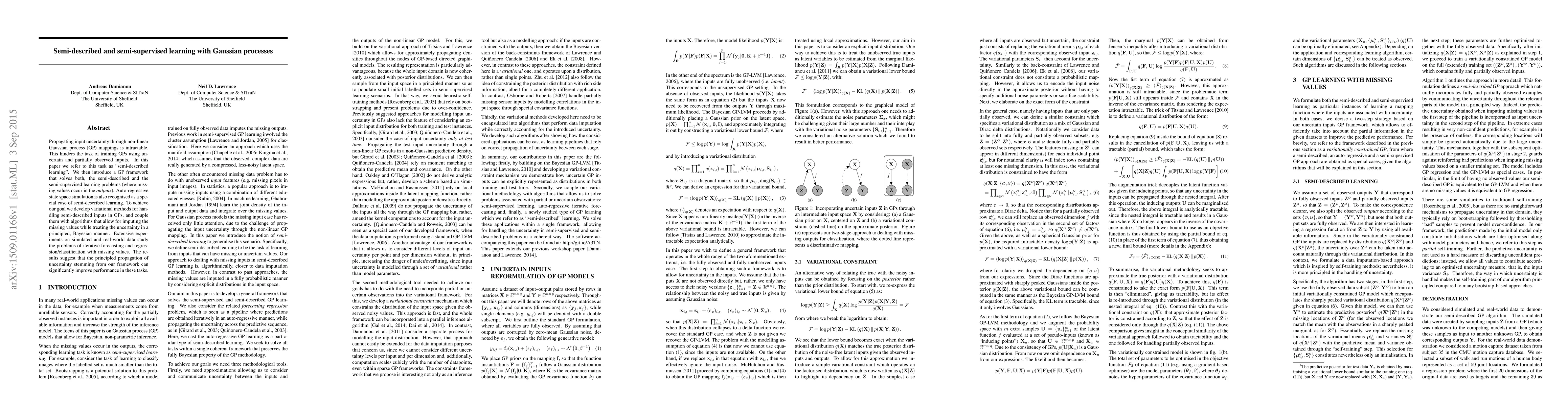 This paper proposes a Gaussian process framework to address semi-described learning, tackling uncertain and partially observed inputs, and semi-supervised learning with missing output values. It introduces variational methods and Bayesian imputation techniques to handle these challenges, demonstrating improved performance in forecasting and regression/classification.