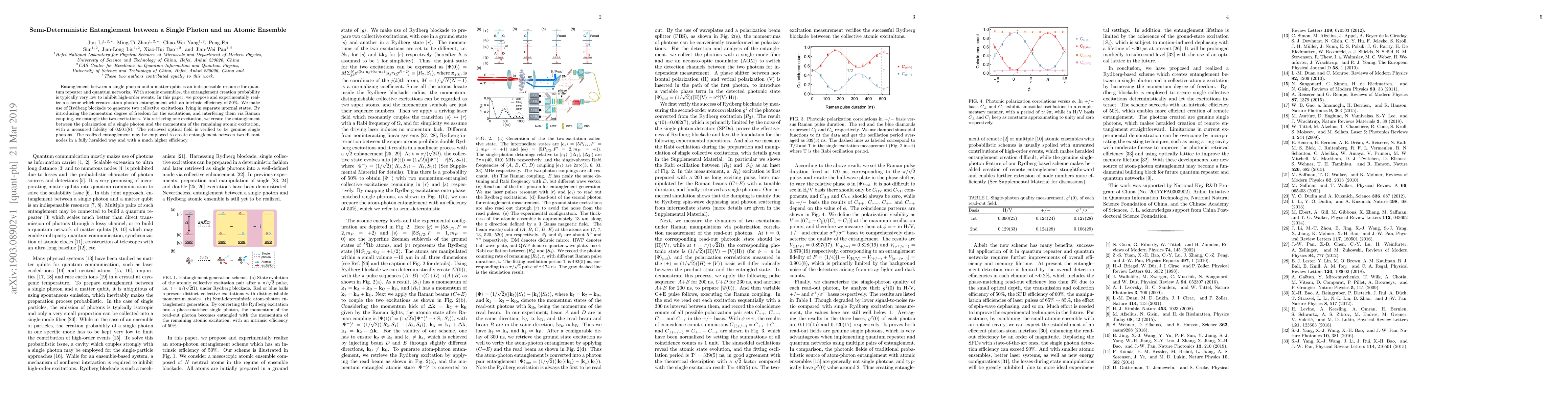 This paper proposes and demonstrates a method to create semi-deterministic entanglement between a single photon and an atomic ensemble with 50% efficiency, using Rydberg blockade and Raman coupling to entangle collective excitations and achieve a fidelity of 0.901(8). The technique holds promise for enhancing quantum repeaters and networks.