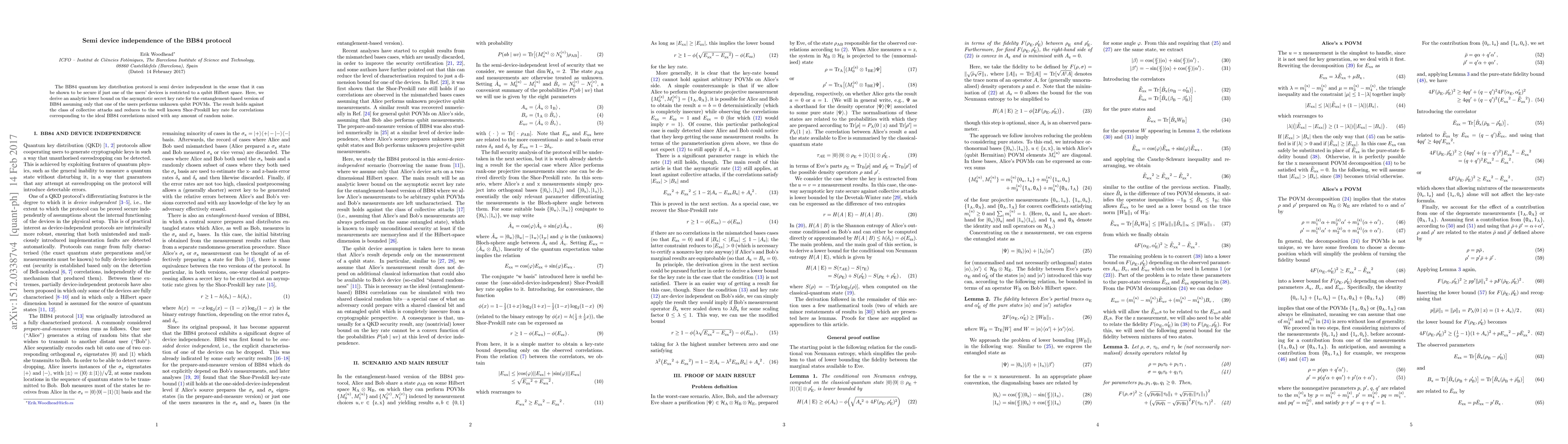 This paper demonstrates the semi device independence of the BB84 protocol, showing it remains secure when only one user's device is restricted to a qubit Hilbert space. It derives an analytic lower bound on the secret key rate for the entanglement-based BB84 protocol against collective attacks.