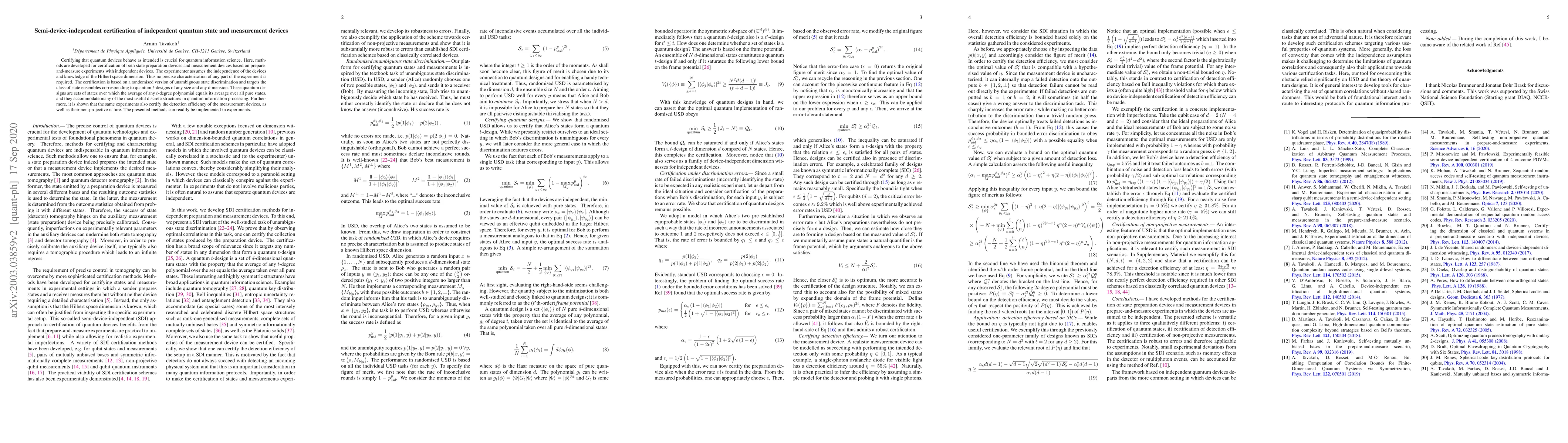 Certifying that quantum devices behave as intended is crucial for quantum information science. Here, methods are developed for certification of both state preparation devices and measurement devices based on prepare-and-measure experiments with independent devices. The experimenter assumes the independence of the devices and knowledge of the Hilbert space dimension. Thus no precise characterisation of any part of the experiment is required. The certification is based on a randomised version of unambiguous state discrimination and targets the class of state ensembles corresponding to quantum $t$-designs of any size and any dimension. These quantum designs are sets of states over which the average of any $t$-degree polynomial equals its average over all pure states, and they accommodate many of the most useful discrete structures in quantum information processing. Furthermore, it is shown that the same experiments also certify the detection efficiency of the measurement devices, as well as their non-projective nature. The presented methods can readily be implemented in experiments.