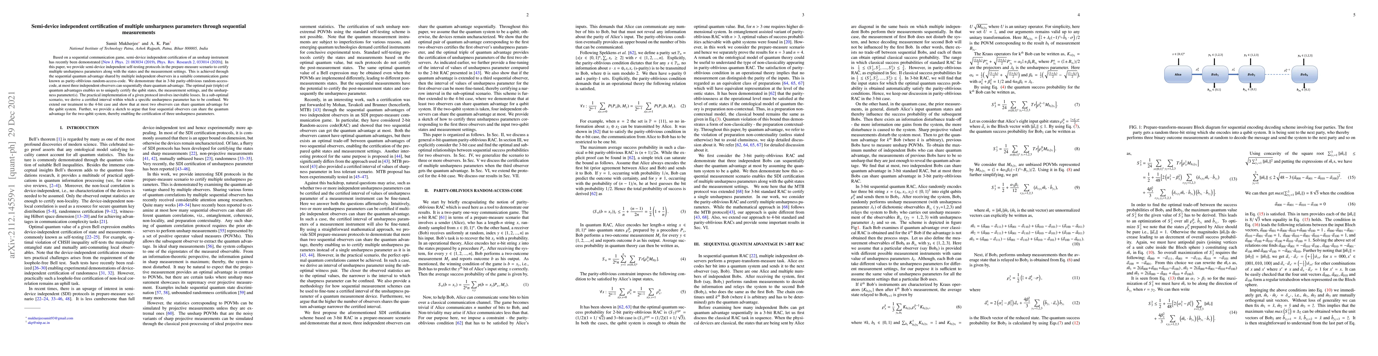 This paper develops semi-device independent self-testing protocols to certify multiple unsharpness parameters via sequential quantum advantage in a prepare-measure scenario. It demonstrates that three independent observers can share quantum advantage in a 3-bit parity-oblivious random-access-code, enabling the unique certification of qubit states and unsharpness parameters, while extending the treatment to show that two observers suffice for a 4-bit case and suggesting four observers can certify three unsharpness parameters in a two-qubit system.