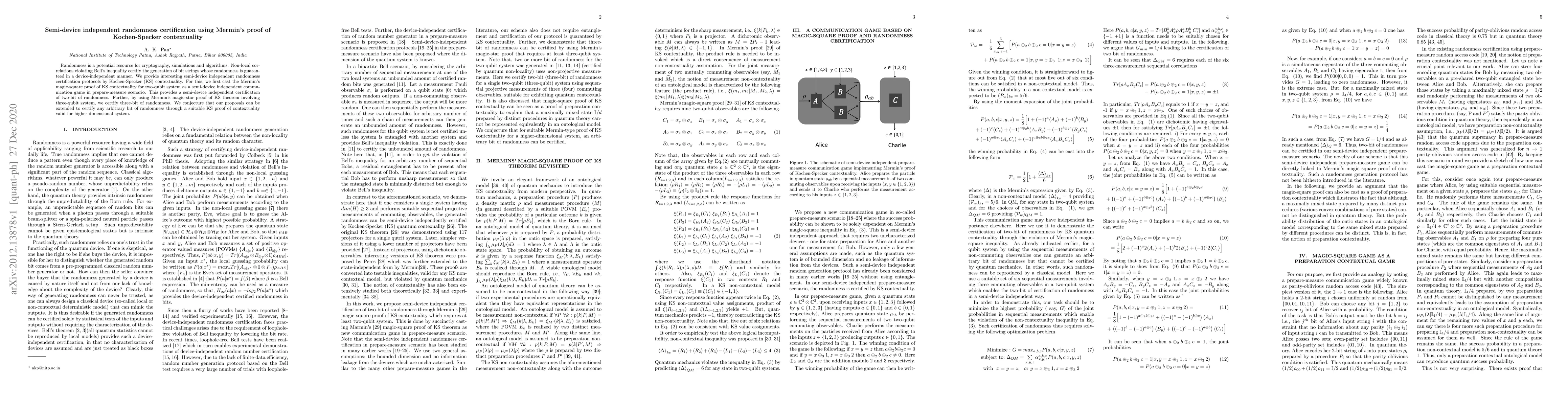 This paper proposes semi-device independent protocols to certify randomness based on Mermin's proofs of Kochen-Specker contextuality, demonstrating two-bit randomness with a two-qubit system and three-bit with a three-qubit system, and suggesting potential extensions for higher dimensions.