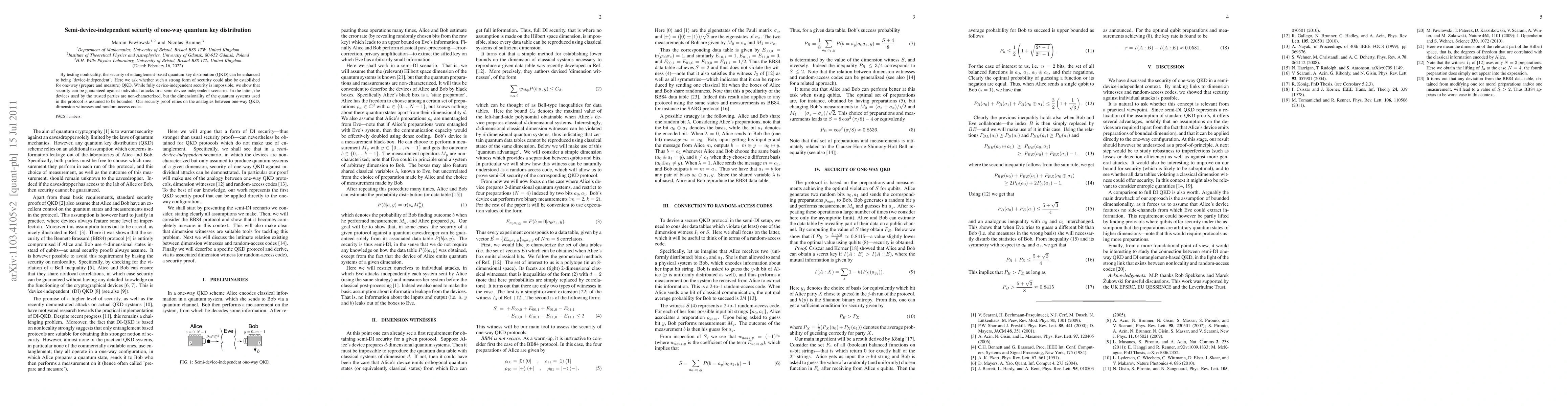 This paper explores the semi-device-independent security of one-way quantum key distribution (QKD), demonstrating that while fully device-independent security is unattainable, a semi-device-independent approach can guarantee security against individual attacks, assuming bounded quantum system dimensionality. The security proof leverages analogies between one-way QKD, dimension witnesses, and random-access codes.