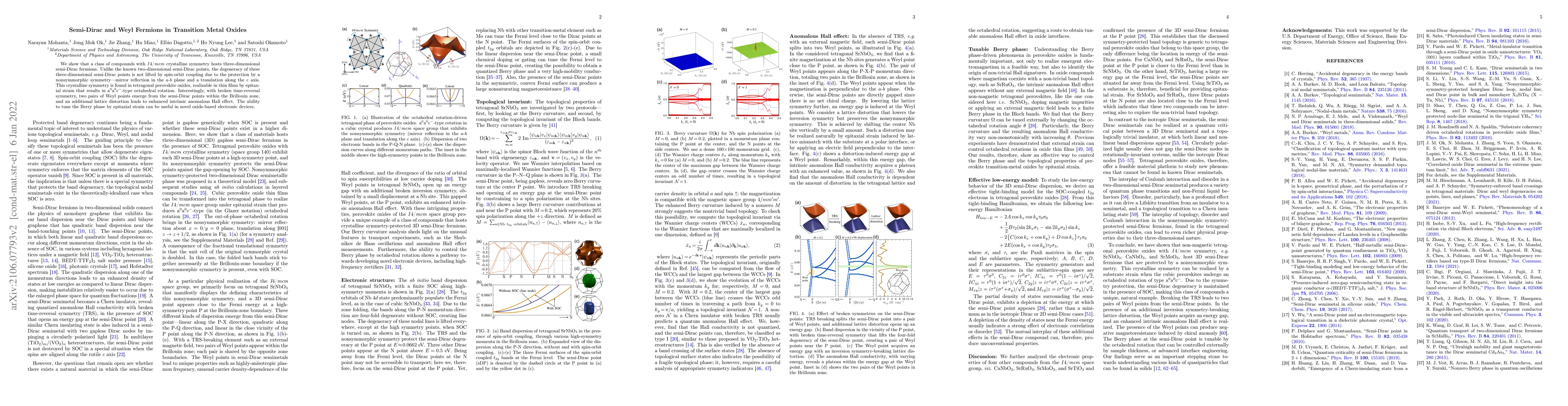 This study reveals three-dimensional semi-Dirac fermions in transition metal oxides with $I$4/$mcm$ symmetry, protected by nonsymmorphic screw rotation and translation. It also finds Weyl points emerging from these semi-Dirac points, potentially enhancing the anomalous Hall effect, with tunable Berry phase via epitaxial strain for novel device applications.