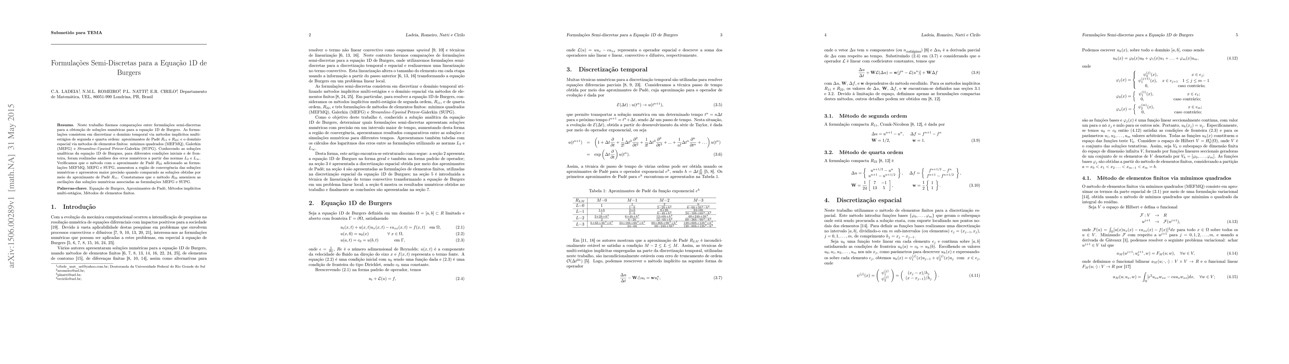 In this work we compare semi-discrete formulations to obtain numerical solutions for the 1D Burgers equation. The formulations consist in the discretization of the time-domain via multi-stage methods of second and fourth order: R_{11} and R_{22} Pad\'e approximants, and of the spatial-domain via finite element methods: least-squares (MEFMQ), Galerkin (MEFG) and Streamline-Upwind Petrov-Galerkin (SUPG). Knowing the analytical solutions of the 1D Burgues equation, for different initial and boundary conditions, analyzes were performed for numerical errors from L_{2} and L_{\infinity} norm. We found that the R_{22} Pad\'e approximants, added to the MEFMQ, MEFG, and SUPG formulations, increased the region of convergence of the numerical solutions, and showed greater accuracy when compared to the solutions obtained by the R_{11} Pad\'e approximants. We note that the R_{22} Pad\'e approximants softened the oscillations of the numerical solutions associated to the MEFG and SUPG formulations.