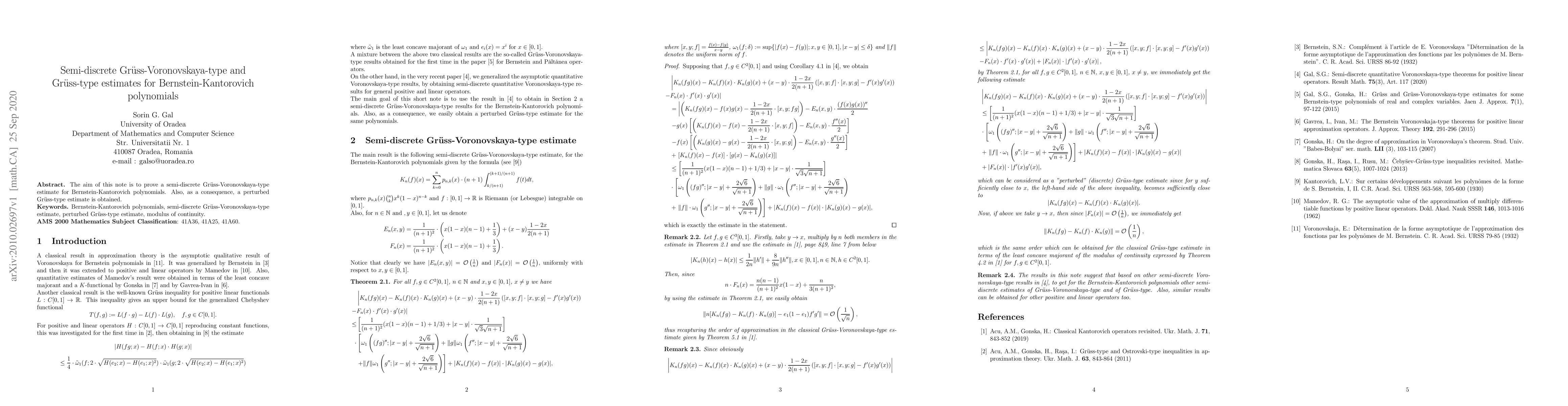 The paper presents a novel semi-discrete Gruss-Voronskaya-type estimate and a perturbed Gruss-type estimate for Bernstein-Kantorovich polynomials, extending previous results in [4] and [5].