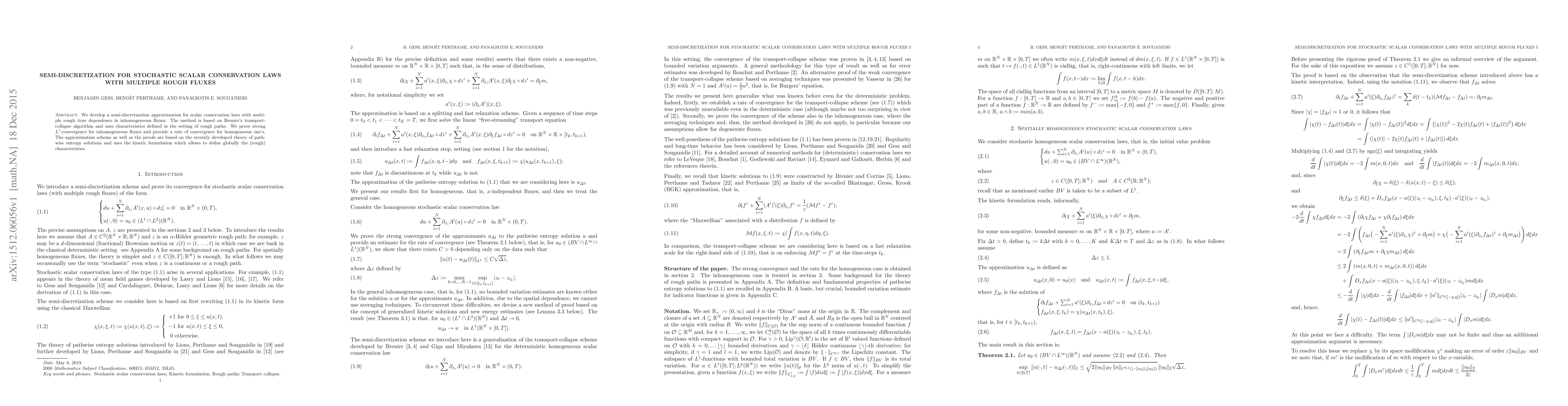 This research introduces a semi-discretization method for scalar conservation laws with rough time-dependent fluxes, utilizing Brenier's transport-collapse algorithm and rough path theory. It demonstrates strong $L^1$-convergence for inhomogeneous fluxes and provides a convergence rate for homogeneous ones, leveraging pathwise entropy solutions and kinetic formulations.