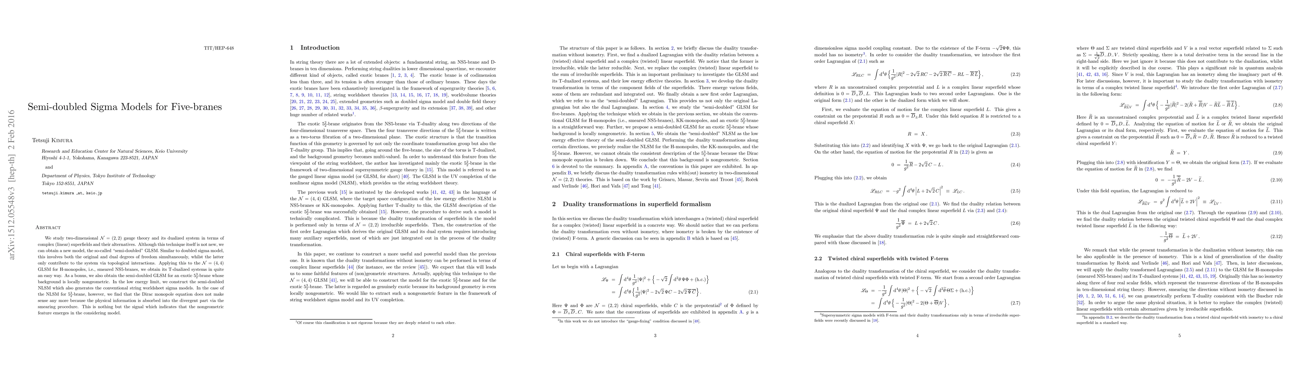 We study two-dimensional ${\cal N}=(2,2)$ gauge theory and its dualized system in terms of complex (linear) superfields and their alternatives. Although this technique itself is not new, we can obtain a new model, the so-called "semi-doubled" GLSM. Similar to doubled sigma model, this involves both the original and dual degrees of freedom simultaneously, whilst the latter only contribute to the system via topological interactions. Applying this to the ${\cal N}=(4,4)$ GLSM for H-monopoles, i.e., smeared NS5-branes, we obtain its T-dualized systems in quite an easy way. As a bonus, we also obtain the semi-doubled GLSM for an exotic $5^3_2$-brane whose background is locally nongeometric. In the low energy limit, we construct the semi-doubled NLSM which also generates the conventional string worldsheet sigma models. In the case of the NLSM for $5^3_2$-brane, however, we find that the Dirac monopole equation does not make sense any more because the physical information is absorbed into the divergent part via the smearing procedure. This is nothing but the signal which indicates that the nongeometric feature emerges in the considering model.