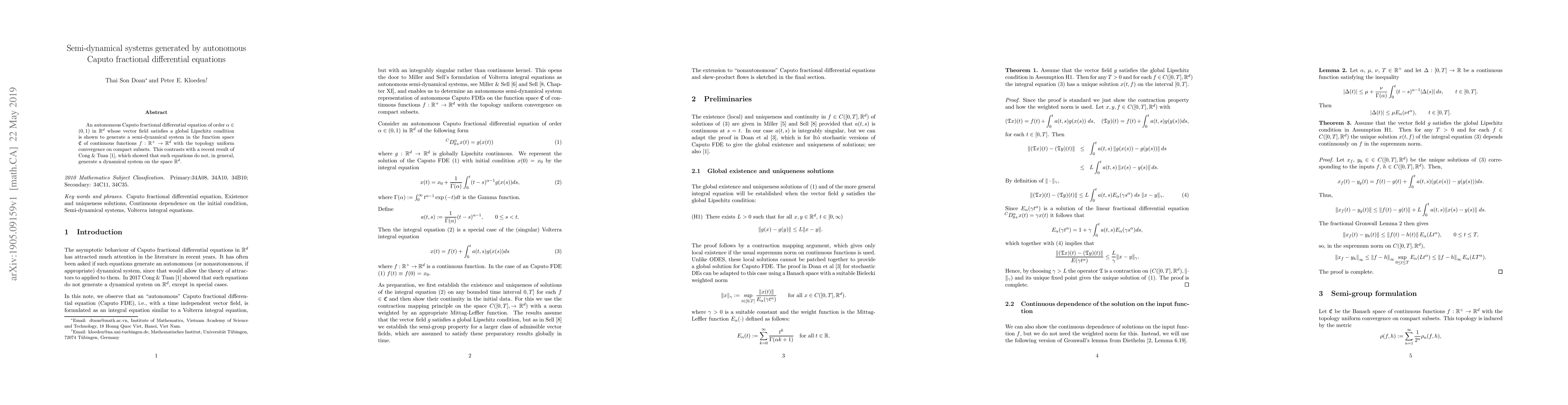 An autonomous Caputo fractional differential equation of order $\alpha\in(0,1)$ in $\mathbb{R}^d$ whose vector field satisfies a global Lipschitz condition is shown to generate a semi-dynamical system in the function space $\mathfrak{C}$ of continuous functions $f:\R^+\rightarrow \R^d$ with the topology uniform convergence on compact subsets. This contrasts with a recent result of Cong \& Tuan \cite{cong}, which showed that such equations do not, in general, generate a dynamical system on the space $\mathbb{R}^d$.