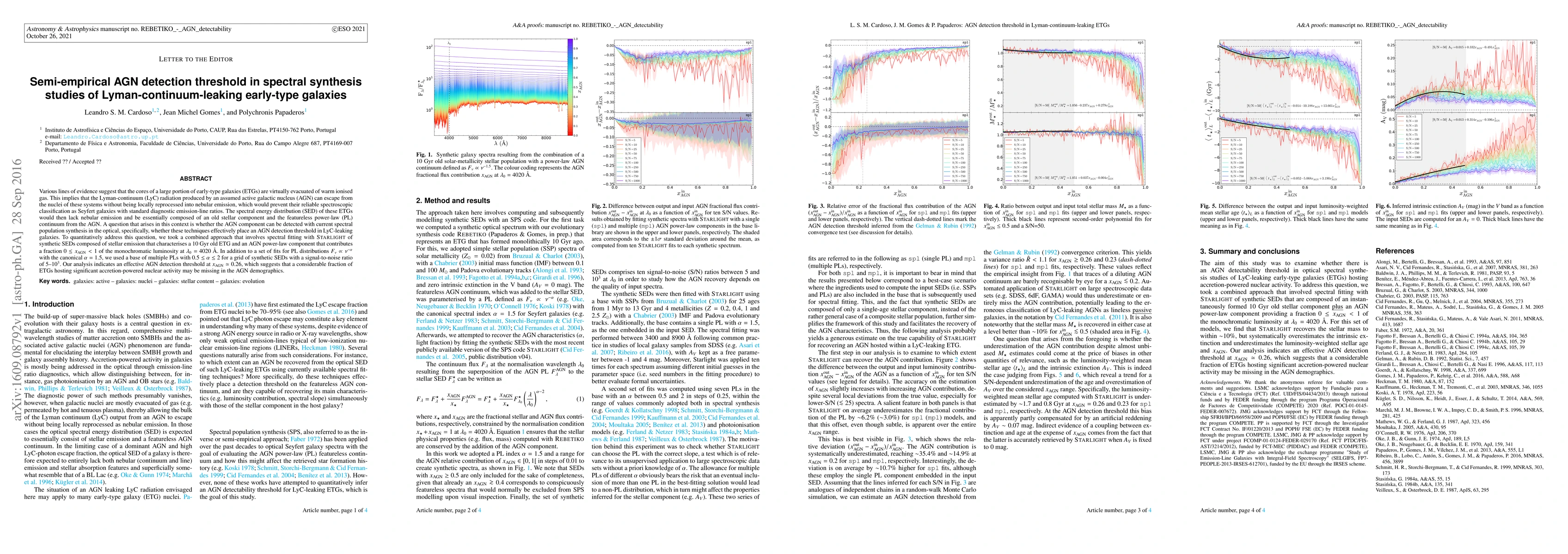 Various lines of evidence suggest that the cores of a large portion of early-type galaxies (ETGs) are virtually evacuated of warm ionised gas. This implies that the Lyman-continuum (LyC) radiation produced by an assumed active galactic nucleus (AGN) can escape from the nuclei of these systems without being locally reprocessed into nebular emission, which would prevent their reliable spectroscopic classification as Seyfert galaxies with standard diagnostic emission-line ratios. The spectral energy distribution (SED) of these ETGs would then lack nebular emission and be essentially composed of an old stellar component and the featureless power-law (PL) continuum from the AGN. A question that arises in this context is whether the AGN component can be detected with current spectral population synthesis in the optical, specifically, whether these techniques effectively place an AGN detection threshold in LyC-leaking galaxies. To quantitatively address this question, we took a combined approach that involves spectral fitting with STARLIGHT of synthetic SEDs composed of stellar emission that characterises a 10 Gyr old ETG and an AGN power-law component that contributes a fraction $0\leq x_{\mathrm{AGN}} < 1$ of the monochromatic luminosity at $\lambda_0=$ 4020 \AA. In addition to a set of fits for PL distributions $F_{\nu} \propto \nu^{-\alpha}$ with the canonical $\alpha=1.5$, we used a base of multiple PLs with $0.5 \leq \alpha \leq 2$ for a grid of synthetic SEDs with a signal-to-noise ratio of 5-$10^3$. Our analysis indicates an effective AGN detection threshold at $x_{\mathrm{AGN}}\simeq 0.26$, which suggests that a considerable fraction of ETGs hosting significant accretion-powered nuclear activity may be missing in the AGN demographics.