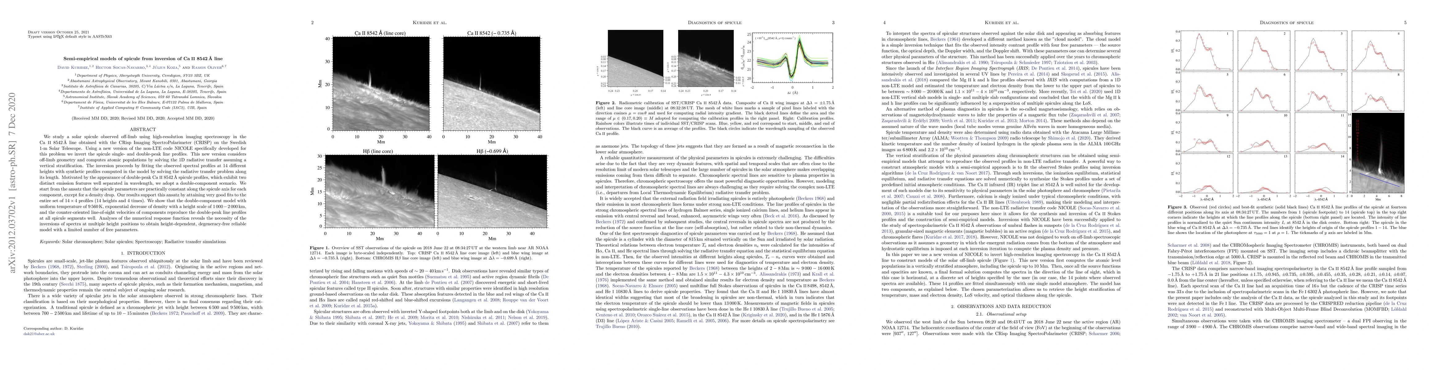 We study a solar spicule observed off-limb using high-resolution imaging spectroscopy in the Ca II 8542 \AA\ line obtained with the CRisp Imaging SpectroPolarimeter (CRISP) on the Swedish 1-m Solar Telescope. Using a new version of the non-LTE code NICOLE specifically developed for this problem we invert the spicule single- and double-peak line profiles. This new version considers off-limb geometry and computes atomic populations by solving the 1D radiative transfer assuming a vertical stratification. The inversion proceeds by fitting the observed spectral profiles at 14 different heights with synthetic profiles computed in the model by solving the radiative transfer problem along its length. Motivated by the appearance of double-peak Ca II 8542 \AA\ spicule profiles, which exhibit two distinct emission features well separated in wavelength, we adopt a double-component scenario. We start from the ansatz that the spicule parameters are practically constant along the spicule axis for each component, except for a density drop. Our results support this ansatz by attaining very good fits to the entire set of 14$\times$4 profiles (14 heights and 4 times). We show that the double-component model with uniform temperature of 9560 K, exponential decrease of density with a height scale of $1000-2000$ km, and the counter-oriented line-of-sight velocities of components reproduce the double-peak line profiles at all spicule segments well. Analyses of the numerical response function reveals the necessity of the inversions of spectra at multiple height positions to obtain height-dependent, degeneracy-free reliable model with a limited number of free parameters.