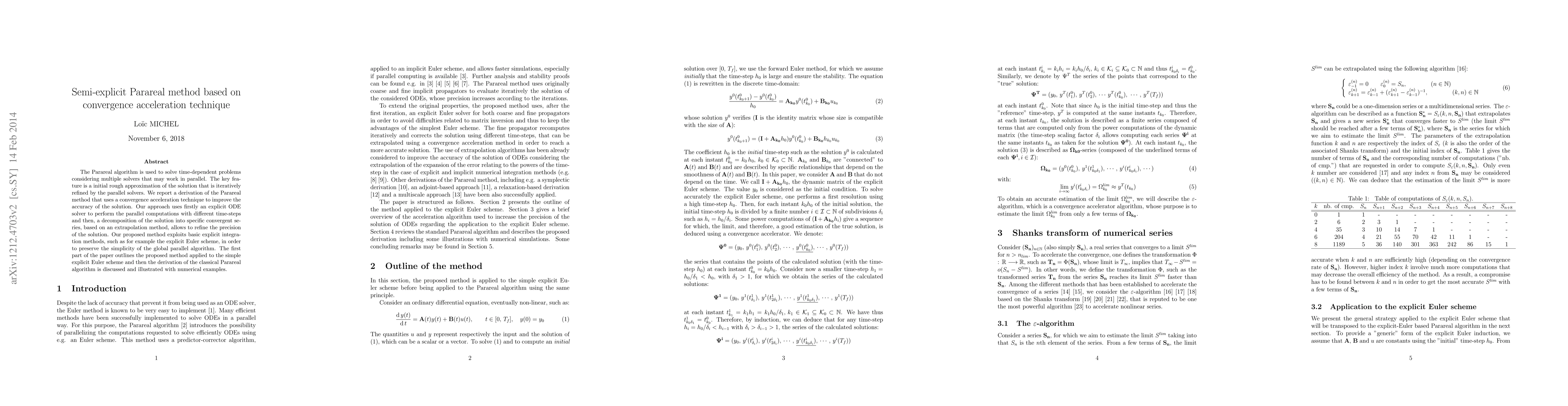 The main technical contribution lies in the semi-explicit Parareal method's derivation, which integrates convergence acceleration techniques and explicit ODE solvers for improved solution accuracy in parallel computing.