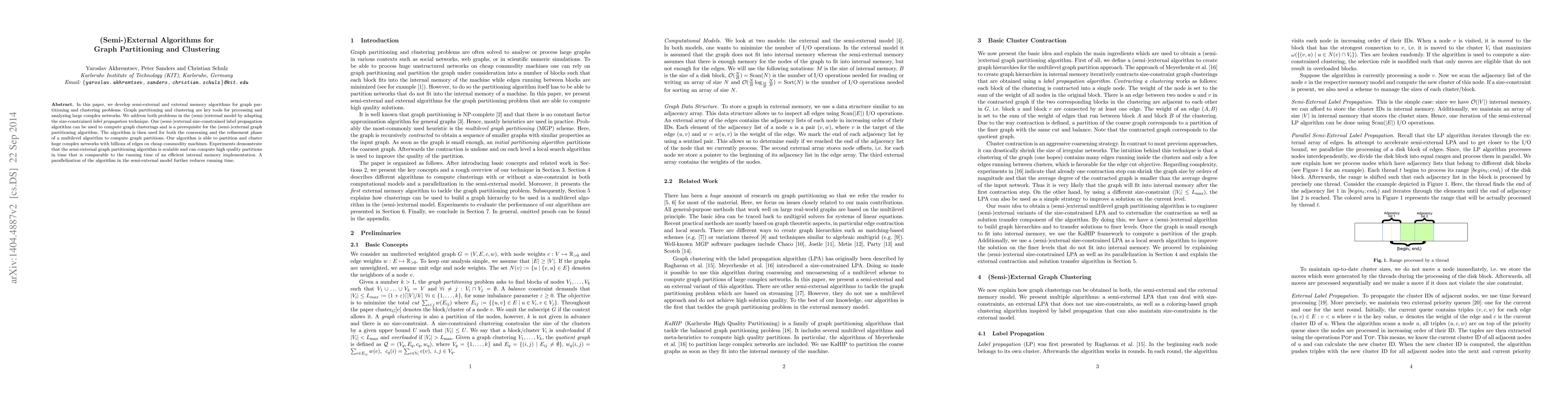 This paper develops semi-external and external memory algorithms for graph partitioning and clustering, utilizing a size-constrained label propagation technique. The proposed algorithm efficiently partitions and clusters large networks, demonstrating scalability and comparable performance to internal memory implementations.
