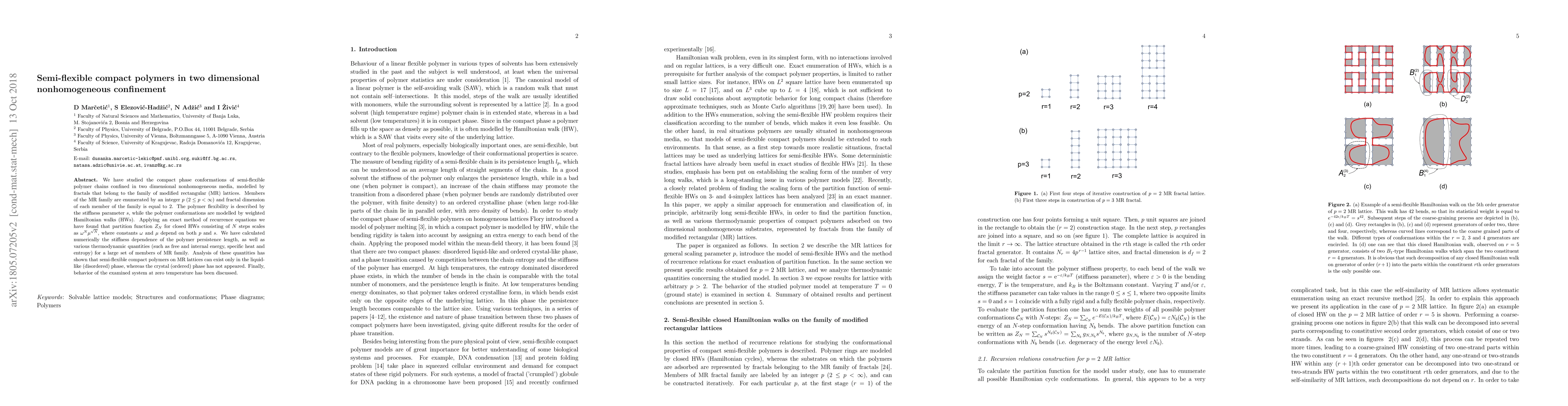 We have studied the compact phase conformations of semi-flexible polymer chains confined in two dimensional nonhomogeneous media, modelled by fractals that belong to the family of modified rectangular (MR) lattices. Members of the MR family are enumerated by an integer $p$ $(2\leq p<\infty)$, and fractal dimension of each member of the family is equal to 2. The polymer flexibility is described by the stiffness parameter $s$, while the polymer conformations are modelled by weighted Hamiltonian walks (HWs). Applying an exact method of recurrence equations we have found the asymptotic behavior of partition function $Z_N$ for closed HWs consisting of $N$ steps. We have established that $Z_N$ scales as $\omega^N \mu^{N^\sigma}$, where the critical exponent $\sigma$ in the stretched exponential term does not depend on $s$, and takes the value 1/2 for each fractal from the family. The constants $\omega$ and $\mu$ depend on both $p$ and $s$, and, in addition, $\mu$ depends on the parity of MR generator. Besides, we have calculated numerically the stiffness dependence of the polymer persistence length and various thermodynamic quantities (such as free and internal energy, specific heat and entropy), for a large set of members of MR family. We have found that semi-flexible compact polymers, on MR lattices, can exist only in the liquid-like (disordered) phase, whereas the crystal (ordered) phase has not appeared. Finally, the behavior of examined system at zero temperature has been discussed.