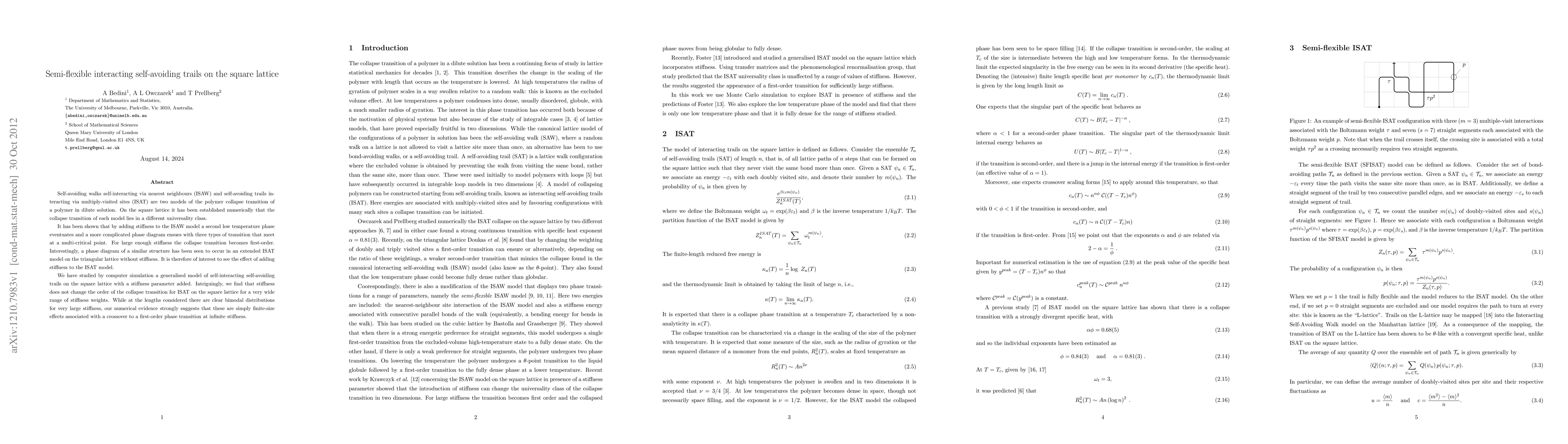 This paper explores the effect of adding stiffness to self-avoiding trails interacting via multiply-visited sites (ISAT) on the square lattice. Despite introducing stiffness, the collapse transition remains continuous over a wide range of stiffness weights, suggesting finite-size effects may lead to a first-order transition at infinite stiffness.