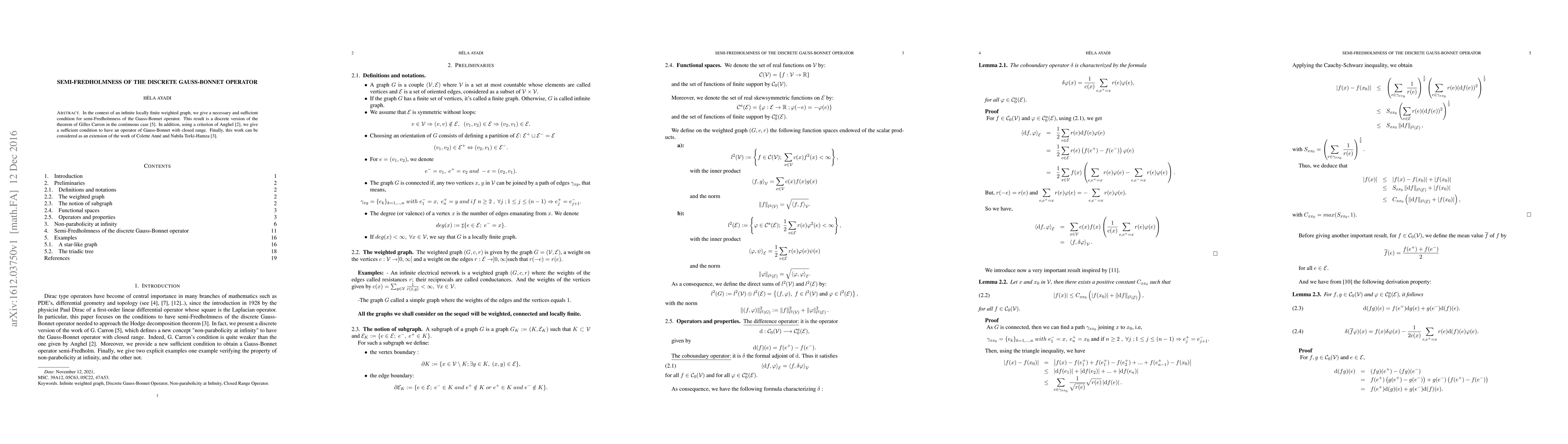 In the context of an infinite locally finite weighted graph, we give a necessary and sufficientcondition for semi-Fredholmness of the Gauss-Bonnet operator. This result is a discrete version of thetheorem of Gilles Carron in the continuous case [5]. In addition, using a criterion of Anghel [2], we givea sufficient condition to have an operator of Gauss-Bonnet with closed range. Finally, this work can beconsidered as an extension of the work of Colette Ann\'e and Nabila Torki-Hamza [3].