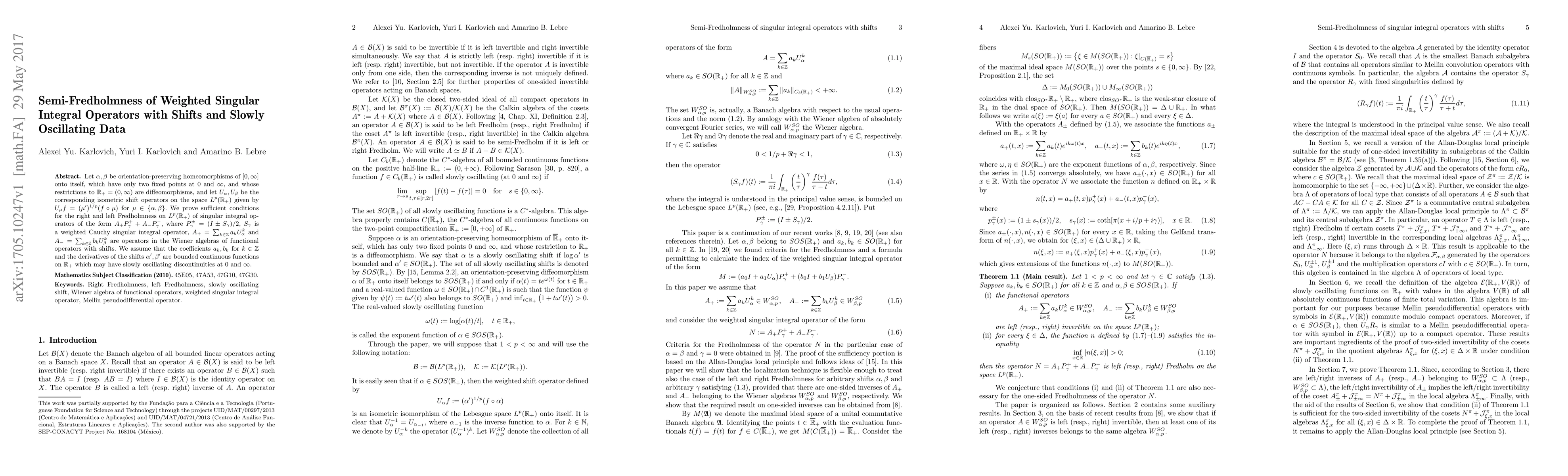 Let $\alpha,\beta$ be orientation-preserving homeomorphisms of $[0,\infty]$ onto itself, which have only two fixed points at $0$ and $\infty$, and whose restrictions to $\mathbb{R}_+=(0,\infty)$ are diffeomorphisms, and let $U_\alpha,U_\beta$ be the corresponding isometric shift operators on the space $L^p(\mathbb{R}_+)$ given by $U_\mu f=(\mu')^{1/p}(f\circ\mu)$ for $\mu\in\{\alpha,\beta\}$. We prove sufficient conditions for the right and left Fredholmness on $L^p(\mathbb{R}_+)$ of singular integral operators of the form $A_+P_\gamma^++A_-P_\gamma^-$, where $P_\gamma^\pm=(I\pm S_\gamma)/2$, $S_\gamma$ is a weighted Cauchy singular integral operator, $A_+=\sum_{k\in\mathbb{Z}}a_kU_\alpha^k$ and $A_-=\sum_{k\in\mathbb{Z}}b_kU_\beta^k$ are operators in the Wiener algebras of functional operators with shifts. We assume that the coefficients $a_k,b_k$ for $k\in\mathbb{Z}$ and the derivatives of the shifts $\alpha',\beta'$ are bounded continuous functions on $\mathbb{R}_+$ which may have slowly oscillating discontinuities at $0$ and $\infty$.