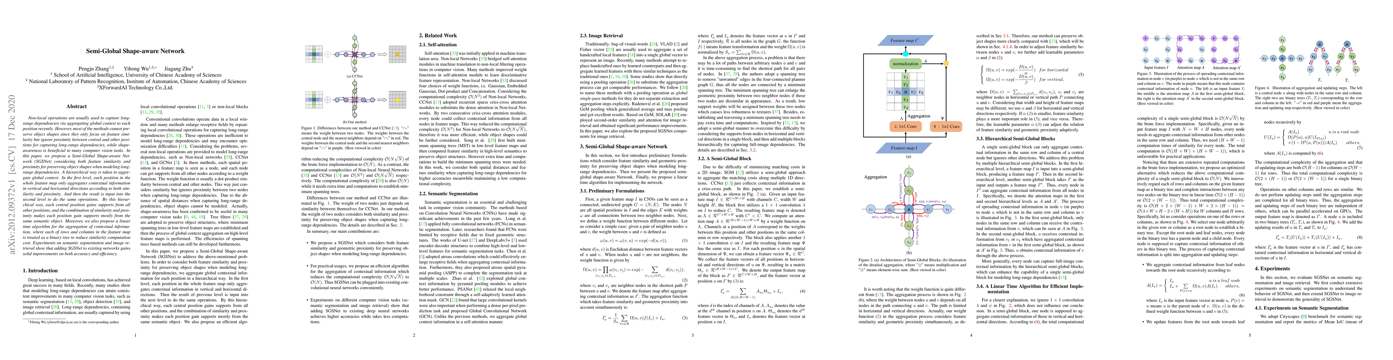 The Semi-Global Shape-aware Network (SGSNet) proposes a method to capture long-range dependencies while preserving object shapes by considering both feature similarity and proximity, enhancing performance in computer vision tasks. The hierarchical aggregation approach and linear time algorithm improve both accuracy and efficiency in semantic segmentation and image retrieval.