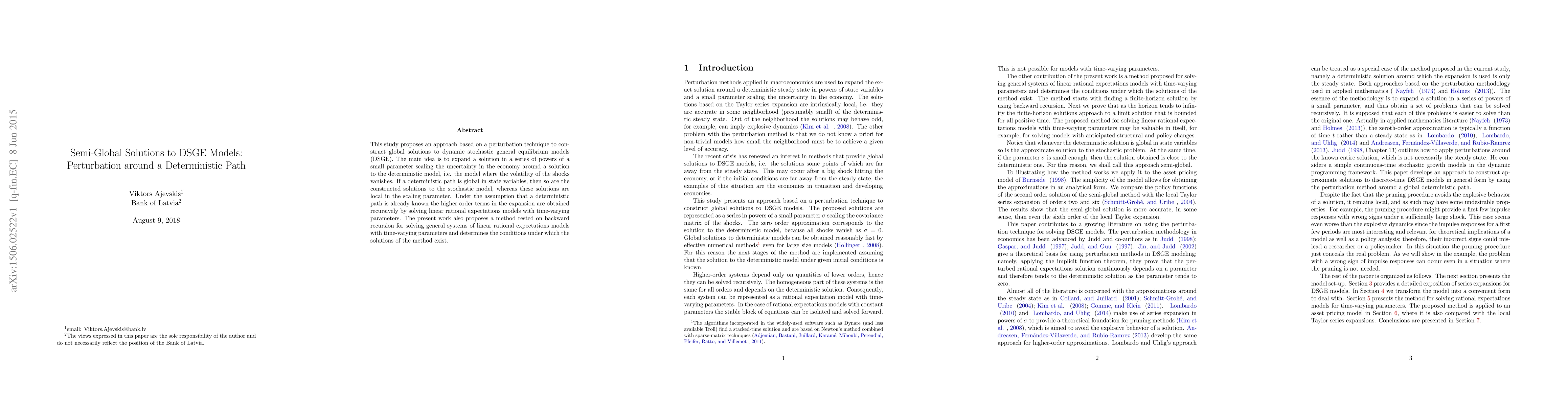 This study proposes an approach based on a perturbation technique to construct global solutions to dynamic stochastic general equilibrium models (DSGE). The main idea is to expand a solution in a series of powers of a small parameter scaling the uncertainty in the economy around a solution to the deterministic model, i.e. the model where the volatility of the shocks vanishes. If a deterministic path is global in state variables, then so are the constructed solutions to the stochastic model, whereas these solutions are local in the scaling parameter. Under the assumption that a deterministic path is already known the higher order terms in the expansion are obtained recursively by solving linear rational expectations models with time-varying parameters. The present work also proposes a method rested on backward recursion for solving general systems of linear rational expectations models with time-varying parameters and determines the conditions under which the solutions of the method exist.