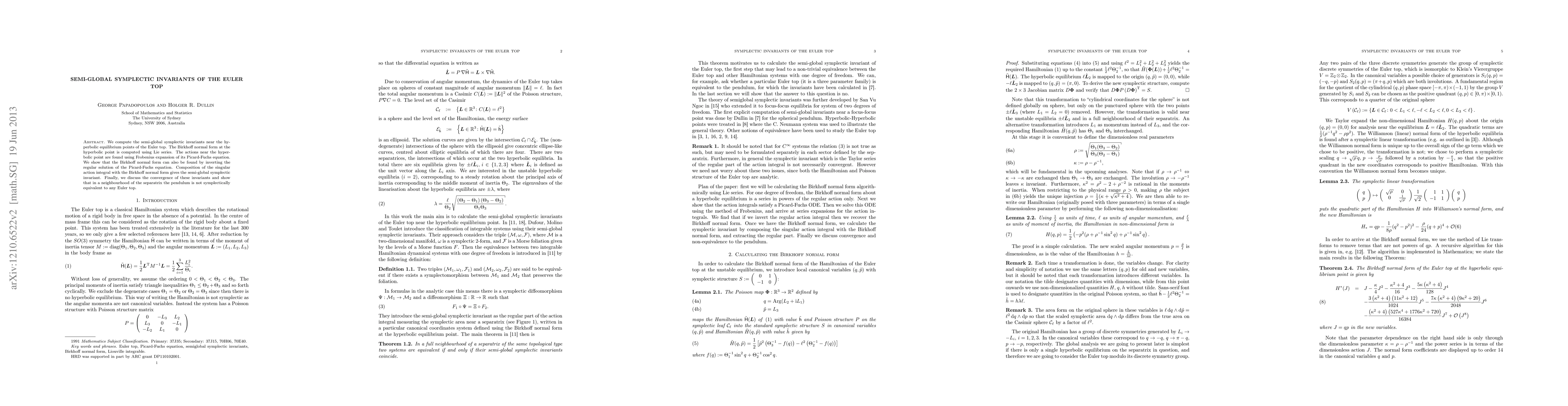 We compute the semi-global symplectic invariants near the hyperbolic equilibrium points of the Euler top. The Birkhoff normal form at the hyperbolic point is computed using Lie series. The actions near the hyperbolic point are found using Frobenius expansion of its Picard-Fuchs equation. We show that the Birkhoff normal form can also be found by inverting the regular solution of the Picard-Fuchs equation. Composition of the singular action integral with the Birkhoff normal form gives the semi-global symplectic invariant. Finally, we discuss the convergence of these invariants and show that in a neighbourhood of the separatrix the pendulum is not symplectically equivalent to any Euler top.