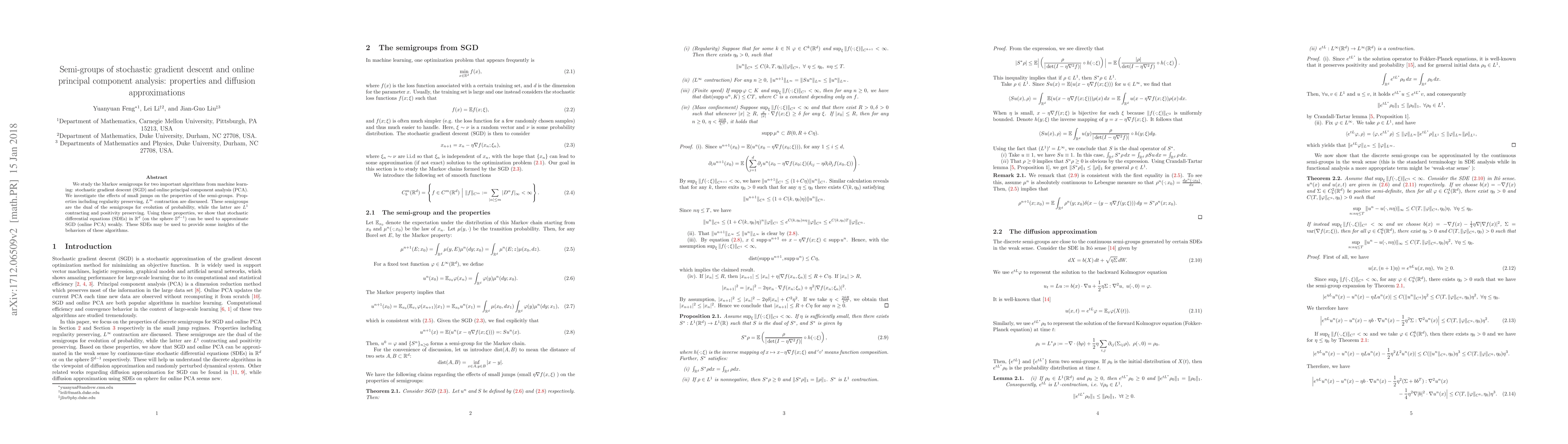We study the Markov semigroups for two important algorithms from machine learning: stochastic gradient descent (SGD) and online principal component analysis (PCA). We investigate the effects of small jumps on the properties of the semi-groups. Properties including regularity preserving, $L^{\infty}$ contraction are discussed. These semigroups are the dual of the semigroups for evolution of probability, while the latter are $L^{1}$ contracting and positivity preserving. Using these properties, we show that stochastic differential equations (SDEs) in $\mathbb{R}^d$ (on the sphere $\mathbb{S}^{d-1}$) can be used to approximate SGD (online PCA) weakly. These SDEs may be used to provide some insights of the behaviors of these algorithms.