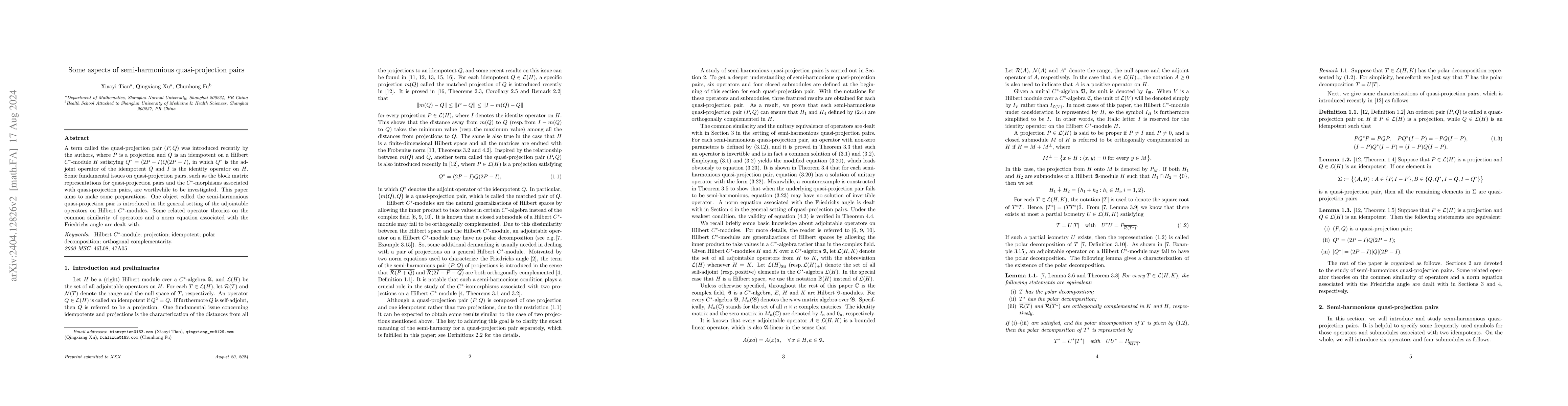 For each adjointable idempotent $Q$ on a Hilbert $C^*$-module $H$, a specific projection $m(Q)$ called the matched projection of $Q$ was introduced recently due to the characterization of the minimum value among all the distances from projections to $Q$. Inspired by the relationship between $m(Q)$ and $Q$, another term called the quasi-projection pair $(P,Q)$ was also introduced recently, where $P$ is a projection on $H$ satisfying $Q^*=(2P-I)Q(2P-I)$, in which $Q^*$ is the adjoint operator of the idempotent $Q$ and $I$ is the identity operator on $H$. Some fundamental issues on quasi-projection pairs, such as the block matrix representations for quasi-projection pairs and the $C^*$-morphisms associated with quasi-projection pairs, are worthwhile to be investigated. This paper aims to make some detailed preparations. Two objects called the semi-harmonious quasi-projection pair and the harmonious quasi-projection pair are introduced and are systematically studied in the general setting of the adjointable operators on Hilbert $C^*$-modules. Some applications concerning the common similarity of operators and a norm equation associated with the Friedrichs angle are also dealt with. Furthermore, many examples are provided to illustrate the non-triviality of the associated characterizations.
