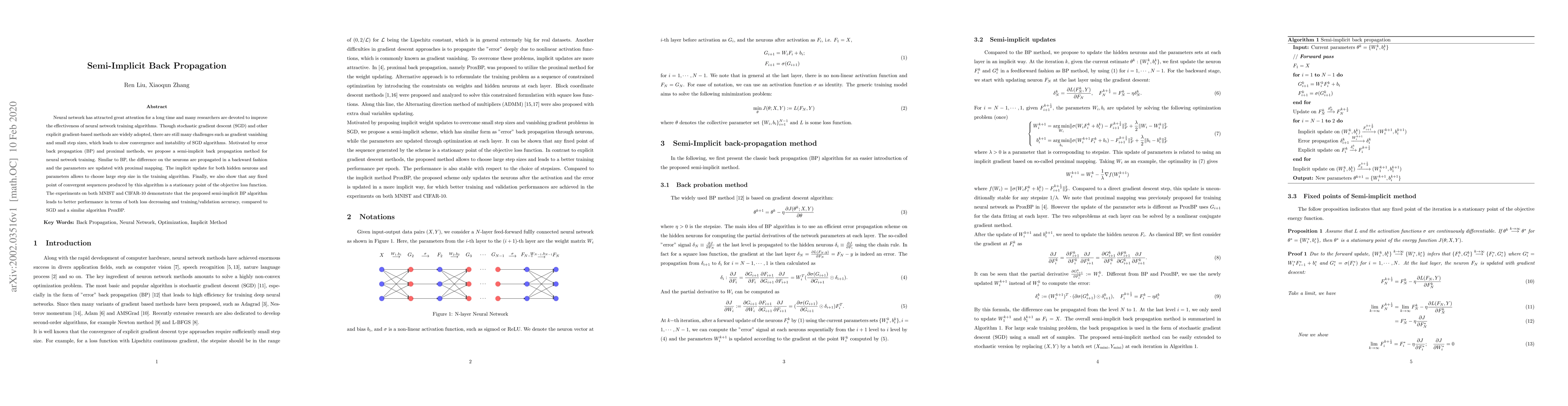 The paper proposes a semi-implicit back propagation method for neural network training, addressing challenges like gradient vanishing and slow convergence of SGD. The method combines error back propagation with proximal mapping, allowing for larger step sizes and better performance, as demonstrated on MNIST and CIFAR-10 datasets.